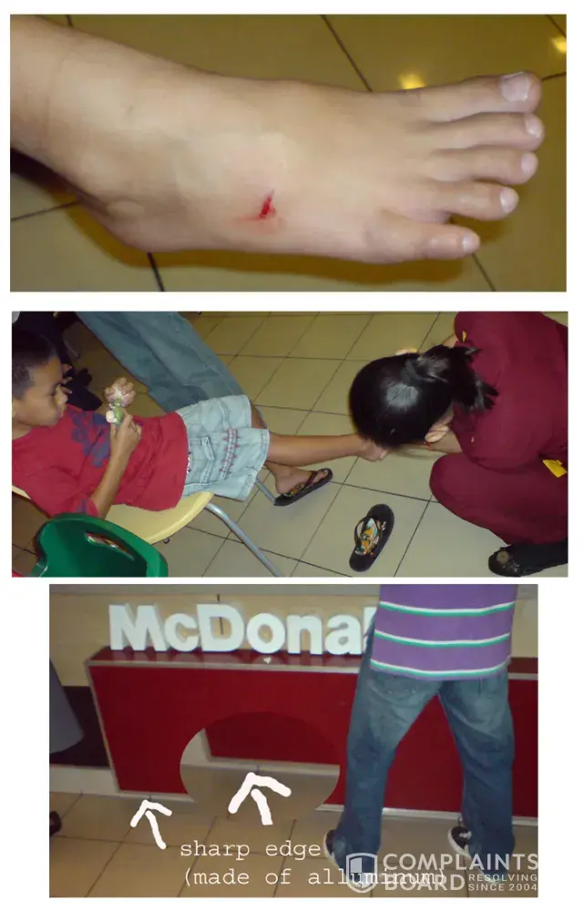 3rd MARCH 2009 (5:PM) - This afternoon after school i took my kids (7yrs old & 5yrs old) to Mc Donalds SM CEBU City PHILIPPINES. My 5 yrs old son order a Happy Meal as I was preparing his food I asked him if he can go to the counter to get a gravy refill. So he went to the counter and ask, but then he came back to me and he was crying he said he hit his foot so I said its ok. So I diverted his attention playing with his new Happy Meal Toy. When we were about to leave he told me he could not walk because his foot hurts, I thought he was just making drama. When I look at his foot (the one his complaining that he got hurt) it was bleeding. So I called the Manager and told her what happened and showed her where my son get his cut. She did not react or say anything, I even asked her for a 1st aid kit she called her staff to get if and did not even said sorry. I was really pissed off my son was wearing flip flops that its hard for him to walk at the mall, specially our car was parked at the other side of the Mall Building. I had to carry my 5yrs old boy all the way to the car.