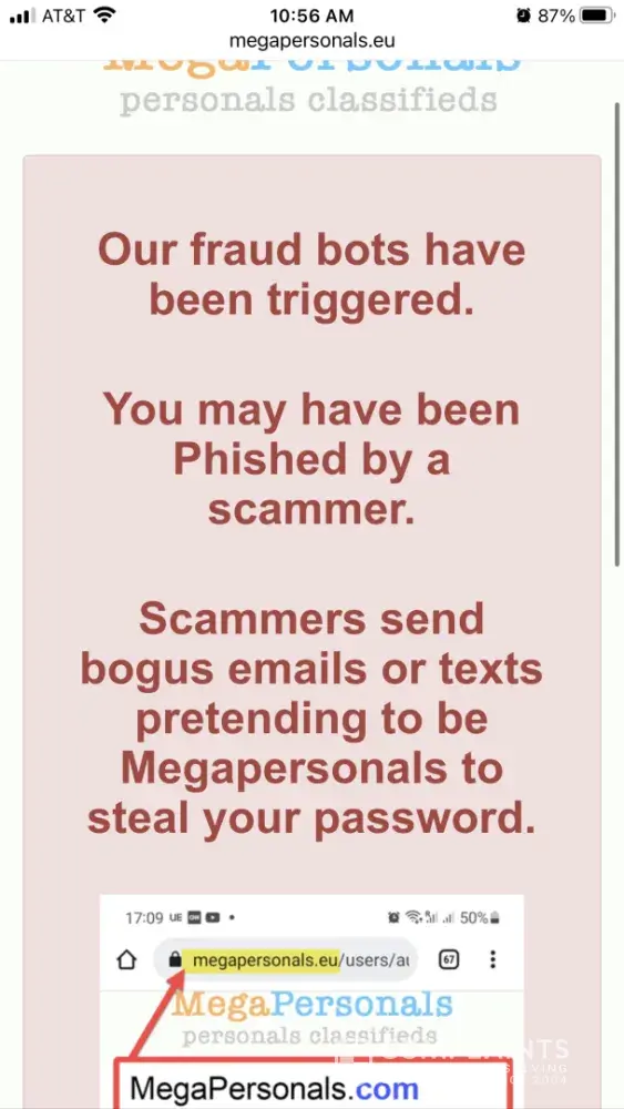 I have been using mega personals for over a year and when I went to bump my ad the frog box were trigger page popped up. I never clicked on anything different I never typed my password in anything and I have been using the same tab on the same device to bump my ad for the last couple months. I have emailed three different emails that I know of to get a hold...