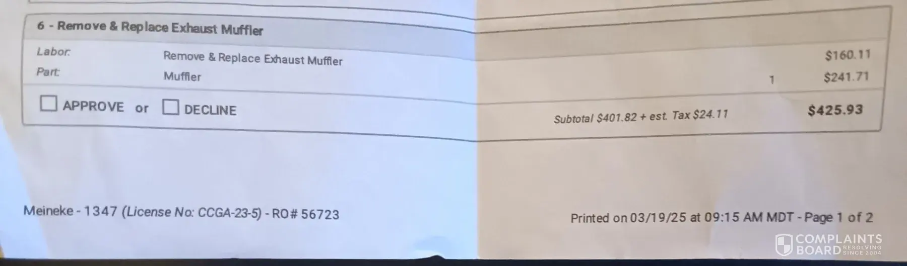 I called Meineke [protected]) online and on the phone and I file a complaint. Next is Arizona Attorney General, BBB, social media and internet review sites.