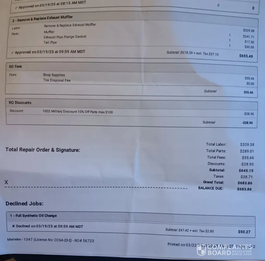 Del Range Location in Cheyenne Wyoming. Took my vehicle in for simple muffler and tailpipe, sat 2 hours, then they came out with a list of issues, I just had new brakes installed couple months ago, they said brake pads weren't making contact with rotors, but the brakes work fine. They said none of my lights worked, I went in there showed them all lights were working, needed cv axles oil seals. grand total estimate $2,369. Said vehicle was not safe. I've been a mechanic for 40 plus years, never seen this level of incompetence and lying anywhere throughout my career, I'm retired Veteran now. After I proved them wrong on the other issues, I asked about the exhaust they quoted for muffler flange and 4 feet of exhaust pipe $425.93. Took 2 days for parts to get in. Took vehicle back dropped off, they said wouldn't be long they would call or text. After almost 3 hours I called for update, they said they needed to show me something, I go in shop the new muffler and flange lying in the floor, and they asked me, where was my tail pipe that comes from the muffler out the rear. I said we went over this 2 times already needed muffler and tailpipe, then says the tailpipe was not part of the quote, and they asked me if I wanted to order my own preshaped tailpipe, and if I brought it in they could install it. At one point in the conversation I was even asked by the tech how I would suggest they run the pipe from the muffler, and I was completely dumbfounded, I assumed they were trained and had some experience in how to do their jobs, I asked aren't you and exhaust shop? he said yes but our pipe bender doesn't work so well, they added another $257.93 which bought new total to $683.86. And they kept it another day, went to pick it up this morning, Tailpipe is Touching heat shield of fuel tank and laying on the suspension bolt, which I took pictures of and showed them, and they said if it rubbed hole in exhaust, they would weld it. I told him not if, but when it rubs a hole in it. I asked should it be redone right so it doesn't become an issue, I told If it rubs a hole, and you weld it once you let it down off the lift the weld will still rub against the suspension. But Service Advisor Gerardo the attitude was let's wait and see what happens Not to mention the vibration from the exhaust pushed up against the differential. Then he said what do you expect our pipe bender only works half the time, and then not like it should. So, I'm beyond infuriated, contacting Meineke corporate, BBB, and possibly small claims court before it's over. Completely unacceptable for company that says they guarantee top notch work. For whatever reasons they evidently don't care, and staff very obviously didn't seem trained well, if at all. I really hope that this is not the same attitude and experience that Meineke wants to project overall for their business, and their reputation. I can't say all their locations are this careless with their customers, But I certainly will never go to or recommend Del Range location to anyone. So, consumer beware.