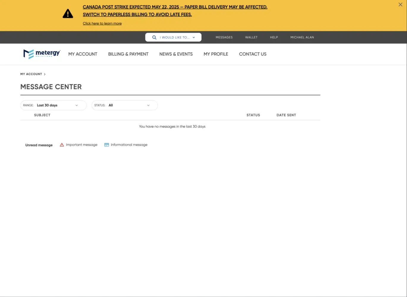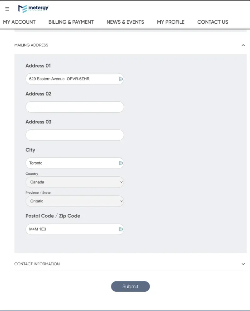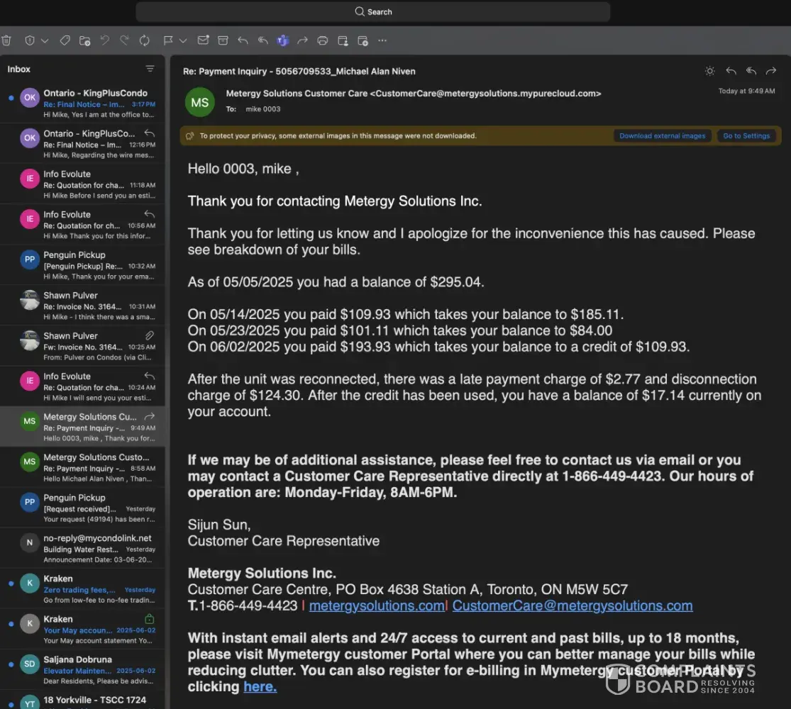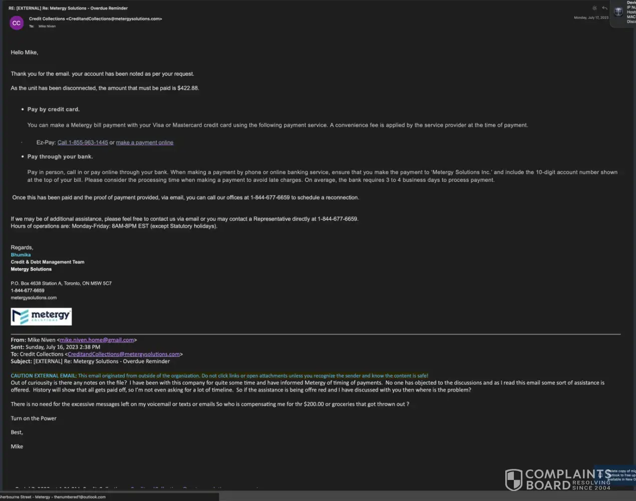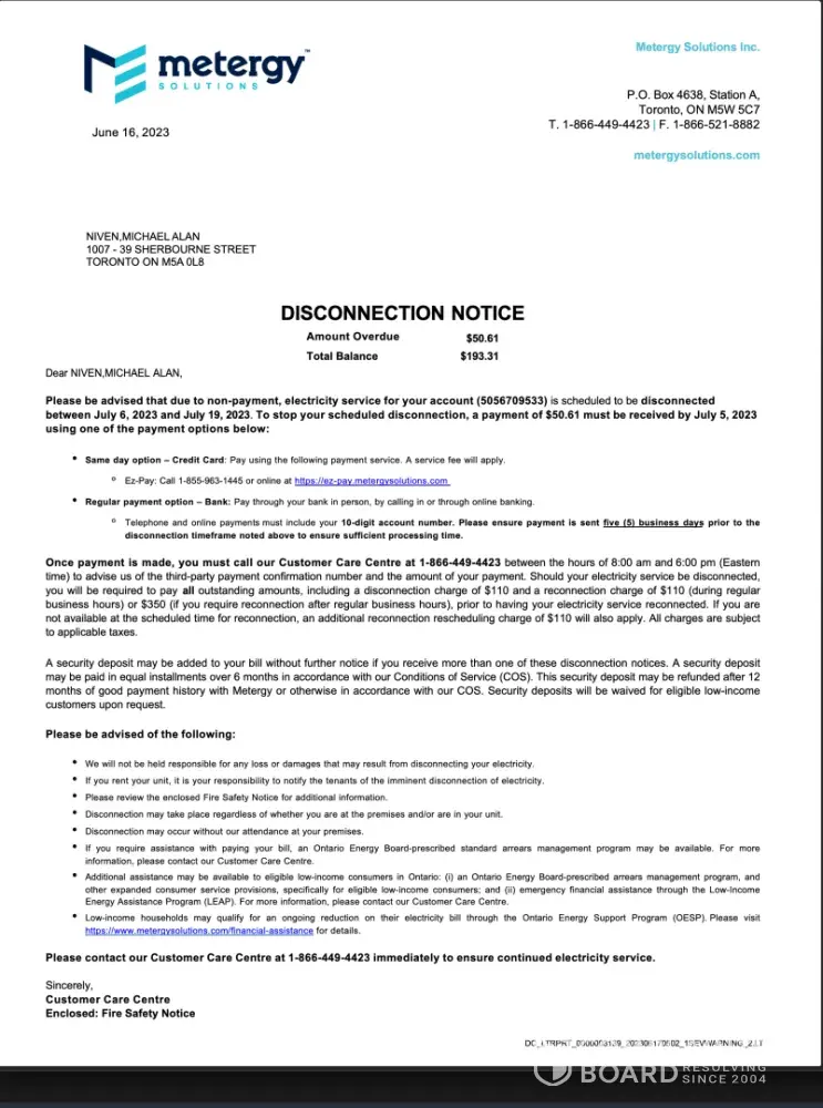 Metergy is the contracted service for our condo building. End of April i was in fact sent a 2 week disconnection notice, the sole venue used for these types of notices as per their polices is by mail. They sent it to the wrong address. Portal allows for a mailing address and they used the service address which i do not check often. it is essentially closed for too much junk mail distributed in the area. With no clue there was an issue and as i was current in my payments. On May 13th this year was sent a 2 day notice, by email, I received it at 3pm, missed it but had prepared payment on May 14th in the evening. on May 15th my unit was disconnected about 5 hours before the expiration of the 48 hour notice.The notice says nothing about disconnection and to make contact before 6pm that day, which I did by email. it is typcial to have to wait if you phone, so sent an email about the power and that a payment was sent the day before sent the receipts as well, nothing. Friday. i received and answer to the email from customer service tthat the payment was made on the 14th, and to assist me in setting up the account, this was on Friday at 6pm, so not power for the weekend. the current invoice was not due until the 29the but there was a carried non payment for when they did the same thing last summer, I have tried to talk to them about it, sent my back up, no reponse. I come back to this. I had tried several times to call in, every time there was a long cue and every time took the option for a callback but never got one. Was communicating through email and customer care continuslaly asking about reconnection and informing them that the errors of not following their policies is the reason for the cut off. it was on day 14 that an email sent and a human called back and put me through to credit to schedule a reconnection. First woman hung up on me, more confused than anything as she put me on hold then hung up. She did confirm that the portal was down completely as i was trying to determine the may 29th payment for any balances, 14th, 23rd and 31st. payments were sent, and ended up overpaying the account which they deducted a disconnection fee, because they cut it too early. have already argued the point and was working with OEB, they never ask for back up. The after i set up reconnection, OEB reaches out that it is resolved and the connection is set up, and suggests i apply for financial assistance. So this time they sent me a notice to the wrong documented address, cut off power after a payment was made, and the agent that turned off the meter never came to my door, and i know this as i was workng in my office beside the entry.and dont follow the information on teh 48 hours notice at all, which i did. Throughout the 14 days agents would come back with points listed in policies that justified the disconnection, like the notice was sent but to the wrong address. Their involvement at each stage seemed more about invoicing a charge than helping get reonnected, so for that time basically had no. power, no lights, was charging battery packs constantly etc.. for 14 days. For the disonnection they claim, there was not info on the charge, and a weird amount on my profile, which only started to wokk but payment history was missing and a credit note. Without my knowlecge they just kept the extra funds and put through the first have of the charge. Last June or july same thing happened, they sent me a notice then a 48 hours notice and as i was way disconnected the power. Why this occured is that being self employed, my checks are irregular, so I phone them to tell them about it and i may miss some due dates, and I did. They told me that they noted my account, once verbally and twice in writing yet there were never any notes on the matter. When the became extremely aggressive, 13 texts in one week, I call in to find out there is not notes, even asked to see my file to verify what s on the file. ignored. this incident was so grossly misleading , they caught a time to issue the disconnection ..I was working with OEB, end expected the charge to show up on teh next invoice, but the response OEB was lame and not well investigated, basically receiving Metergy s version and going with that, and both times e i had back up. which they didn't want. I told OEB that my extra check was confiscated, and inquired if they were ending at their resolution or do they continue with the complaint. No answer. Essentially this is a monopoly and they have a contract which they made with the developer and we are stuck with this company until next year, they own the meters as well. so i guess they think they can do what they want. As per their policies, I did not break any of them, while they didnt adhere to them. i might just move.