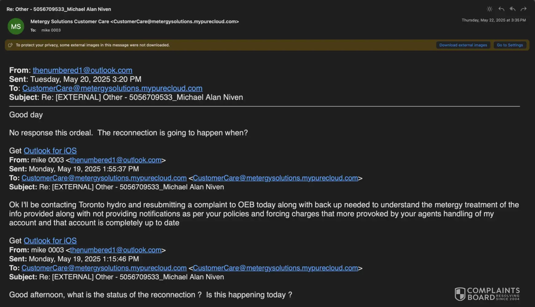 The most frustrating issue is metergy just replied 2 email from my 6 emails. Are they treating this as a complaint? Or I need to escalate to high level?