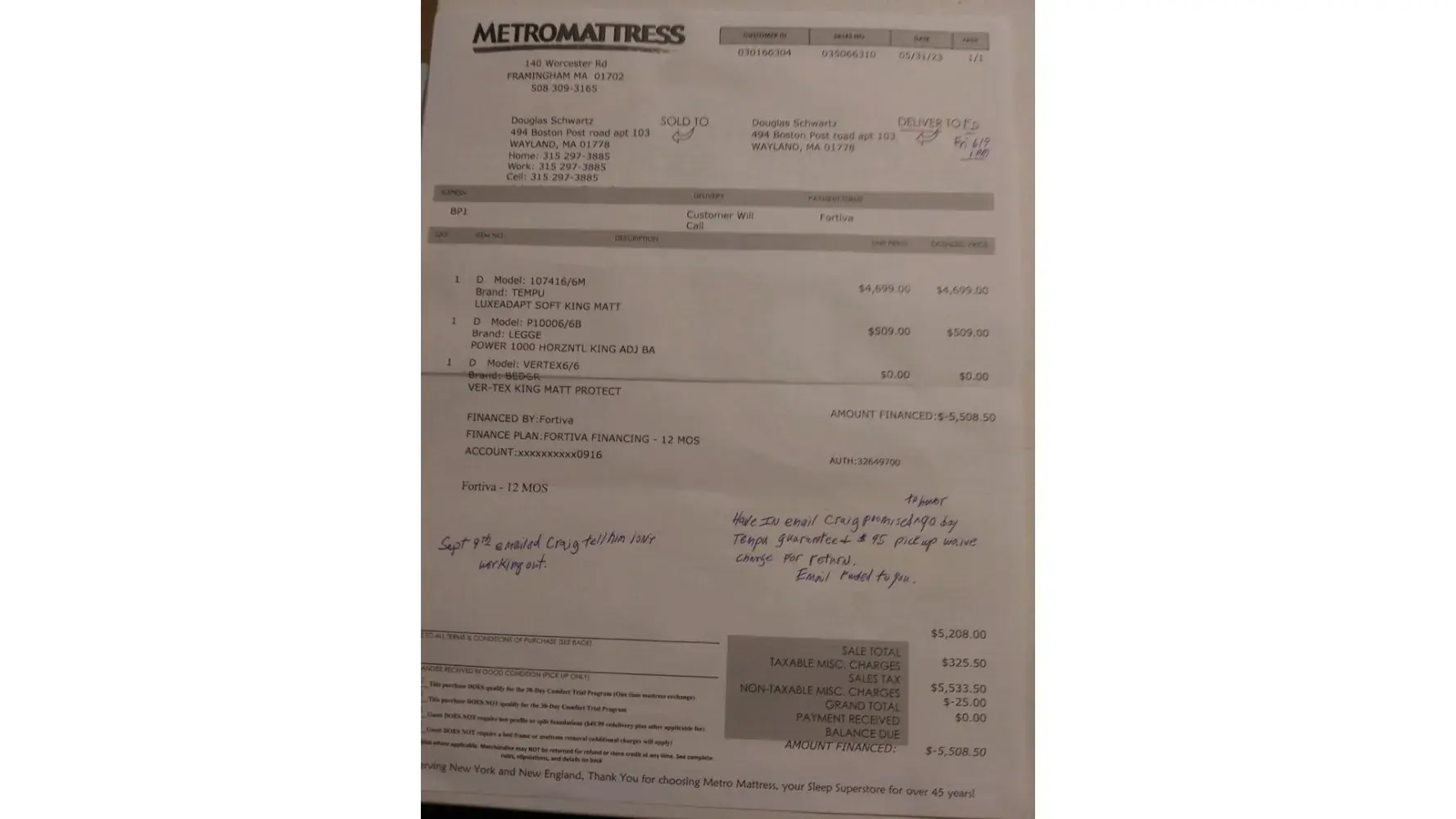 I purchased a *** bed on 11/14 for $2,673.92 at the Metro Mattress in Horseheads NY from sales person Justin. The bed was very uncomfortable to say the least and I went back to store to exchange for different bed after 8 days. They gave me hassle at first because I didn't purchase the comfort exchange for $99.99 and the bed protector for $149.99. We'll the sales person never mention either one to me at the time of purchase. So they did finally agree to exchange but i had to purchase the comfort exchange and the protector and I couldn't get price difference of the 2nd bed which was $1800. So i lost $700 for price difference and had to pay additional $269.98...Fast forward I get the 2nd bed but its just as worse as the 1st bed. I slept on it for 3 hours to wake up with a big depression in the center of the bed. I go back to store next morning because I want a refund at this point and the store manger Steve D acted like he could careless and claimed he will contact the regional director of sales Emma S which he did not. Instead he calls me stated that someone from customer service will call next week to come out to do a dip measurement! I'm at the point of getting a lawyer to do a class action lawsuit for all the people who had problems with Metro Mattress. They sale junk overpriced mattresses...WARNIG!DO NOT DO BUSINESS WITH THEM!