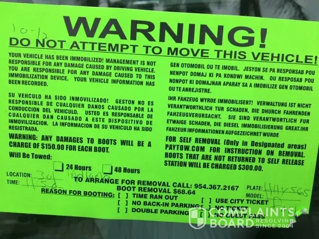 Had to call police to get a supervisor to come with a card reader, so people could get the boots removed from their cars. I paid for the parking, and had more then 10 minutes left, they booted my car anyway. Please revoke their license to do business in your city. We won't be going back to Hollywood Beach.