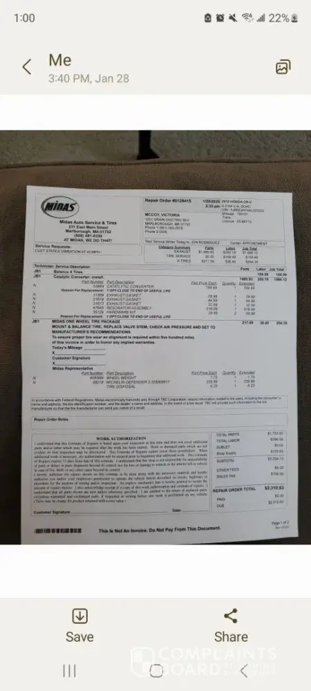 Subject Dear Midas Customer Service, I am writing to formally file a complaint regarding the services I received at the Midas location located at 8811 Highway 6 South, Houston, Texas, and to request resolution due to unresolved and worsened vehicle issues following service. On November 24, 2025, I brought my vehicle to this location because the...