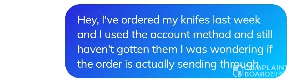 I ordered four knifes from them and never gotten them also they never answered my chats with them so it is a big fake. That is my Chat with them and still haven't answered and it's been weeks.
