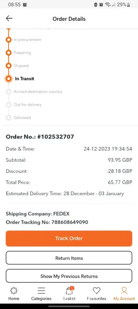 I order my item on the 5.12.22. On the 13th delivery driver phoned to say which house to deliver to. He then put phone down and put customer not answering. Spoke to modanisa they said door number was missing so update that. On the 19th I refused package at my door. On the 20th I refused package again as I wanted my refund. On the 11th.01.23 package was received at depo. I am still waiting for my refund. You speak to the advisor they ask for proof you send them proof you get a email back we have closed your case. Or they say your shipment is still in Turkey.