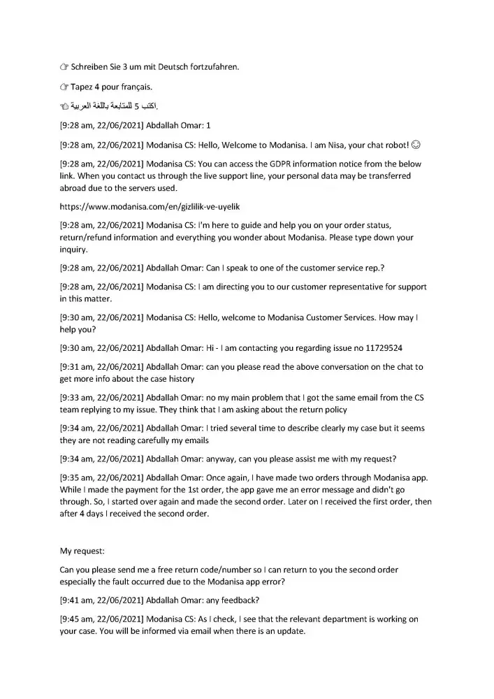 I hope that the Modanisa team would respect their customer and our time, and to consider my complaint and solve it.