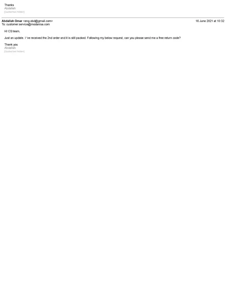 After 5 days from receiving the first order, I received the 2nd order. I contacted the CS team by email to describe my issue and to get from them a free return for the 2nd order but they just replied to me with the return policy. I contacted the CS team several times through Whatsapp and all they have done is just re-open the case. Also, they informed me that the CS didn't consider my request as a repeated order because they have different dates and different items. So I explained the reason of that, which is I found the offer on some items in my first order was ended so I bought another items because of that the 2 orders are not identical and I requested from the CS rep to describe clearly this when re-open my case again.