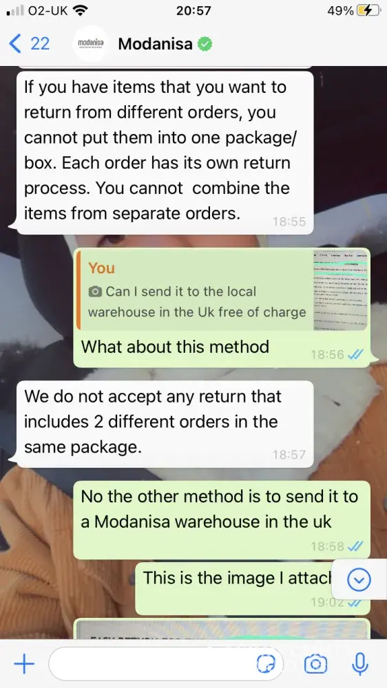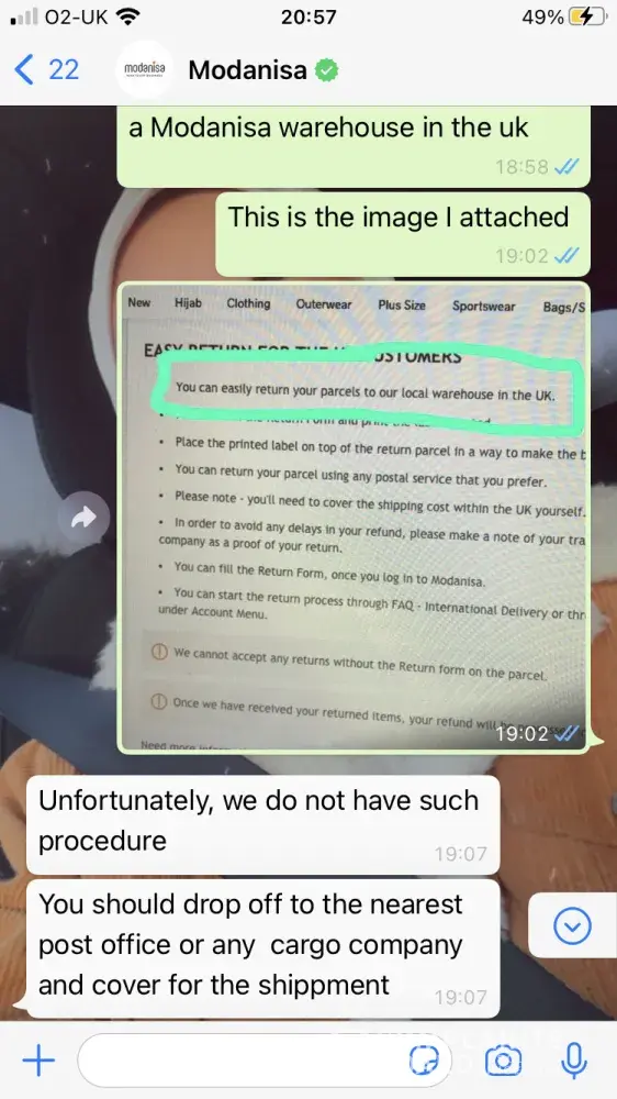 At the end I received an email from the CS team that mentioned that I could return my packages through express return with a fixed service fee of $9.90 which will be deducted from my refund amount and I don't have to pay to the shipping company when I drop your package. Therefore, I have done all the packaging and tried to find how I can do the express return on Modanisa website but I didn't find it. I contacted the CS team again through whatsapp and the CS rep. said that I am not eligible for the express return! which means that I have done all of the packaging for nothing. I was very disappointed because I wasted my time as a result of Modanisa again (this time because the CS team provided me incorrect information) Moreover when I tried to explain my dissatisfaction to the CS rep, he/she terminated the conversation after 2 minutes while I was writing! I even requested the CS rep. to escalate my issue and he/she ignored my request (please see my whatsapp chat for reference)