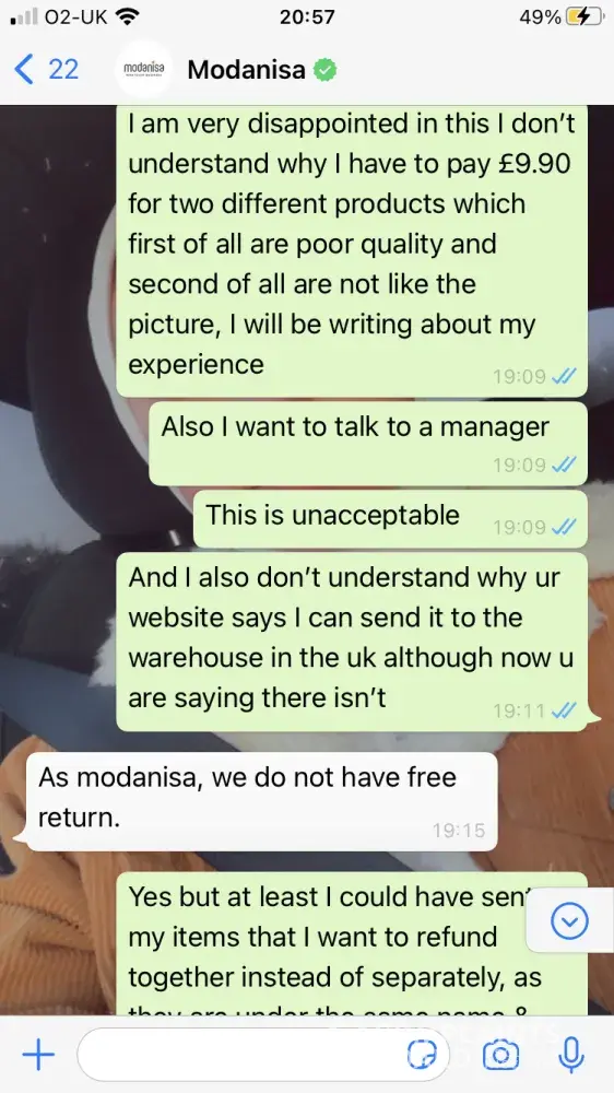 I ordered 3 burkini's, all of which had a satin material and are quite thin unlike in the images where it looks thick and elastic (as a swimsuit should be), When I came to refund the items I was informed that I had to pay £9.90 on each of my packages (two packages) although when I came to look at the product itself the refund policy wasn't there, anyways when I contacted customer service via WhatsApp, I asked if I could refund for free as the items are faulty and not as described, but was informed that this wasn't an option, then I asked if I could at least put the items together so I wouldn't have to pay delivery for each package and they still said no. If the quality of the burkini wasn't poor I wouldn't have requested the refund in the first place, so why am I paying the price for modanisa's mistake. Also on their website it says that they have a warehouse in the UK which when I asked customer service where this was I was told that there isn't one, so if there isn't one why would you put misleading information on the website. I would like to refund all three items with no delivery fee.