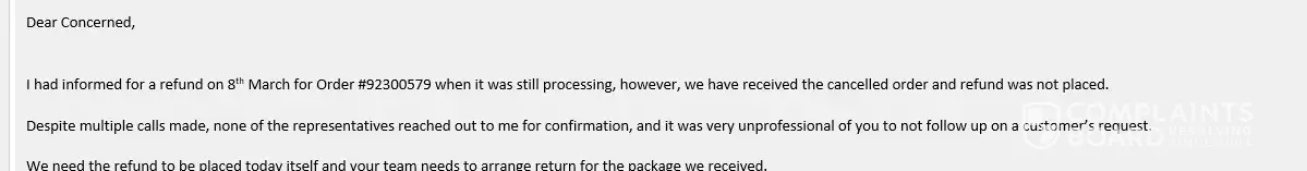 We wanted to cancel the order since because of their website error it got ordered twice. We informed them on 8th March (when the order was still processing) by call as well as email but they did not take an action and it got delivered on 12th March..