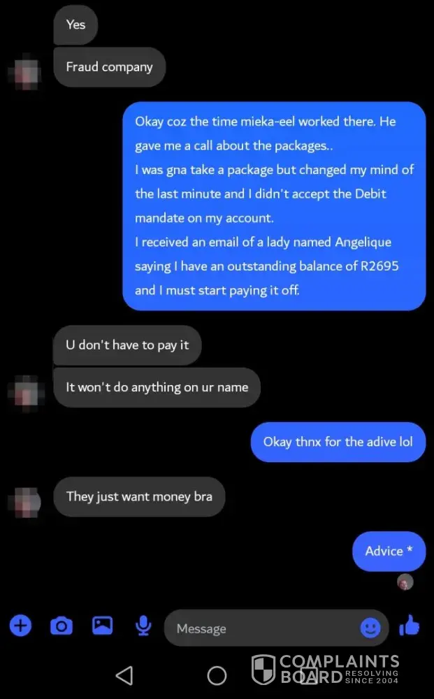 Today I received an email to say I have an outstanding balance of R2695 and I received a call saying that I have an outstanding balance of R2695 and I should email them to say I want to cancel my package and that I should make payment arrangements. And I sent the email and everything.