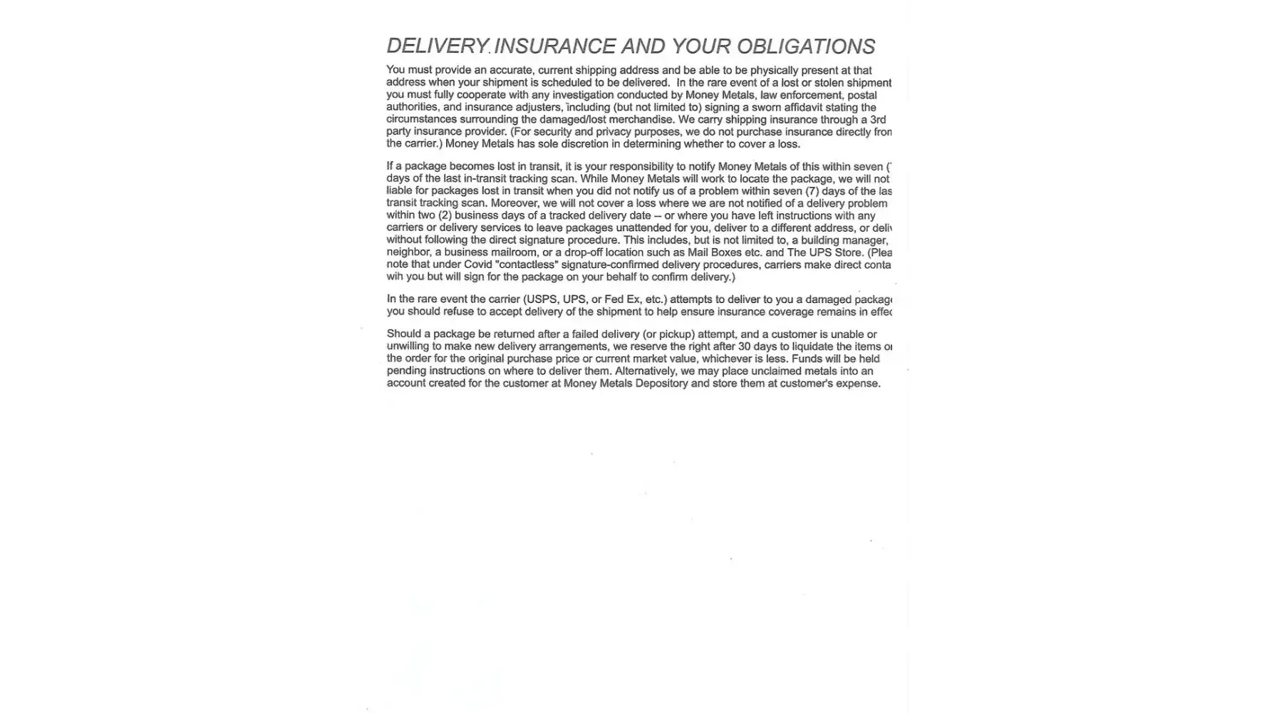 first i placed an order and transferred funds to there acct. they then charged the acct the wrong amount, then had to wait for that to be repaired and they charged the acct again. the product took longer than expected to ship. The US Postal shipping they used said signature required so i stayed around all day Saturday and no shipment then it was rescheduled for 2pm Monday and no package then they left the package in the mailbox with no signature at around 3:30pm today. I called money metals because I received a tracking email that said the item had been delivered to the address and left with an individual and signed for by my name. NEVER SIGNED AND DIDNT KNOW IT WAS HERE UNTIL THE *** The package was left in my mailbox by the postal service. when i told the money metals lady she said sounds like i need to shop elsewhere and so i will and maybe if you read this you will too. I know they cant help the sorry postal service we have but they can ship in a much more secure manner.