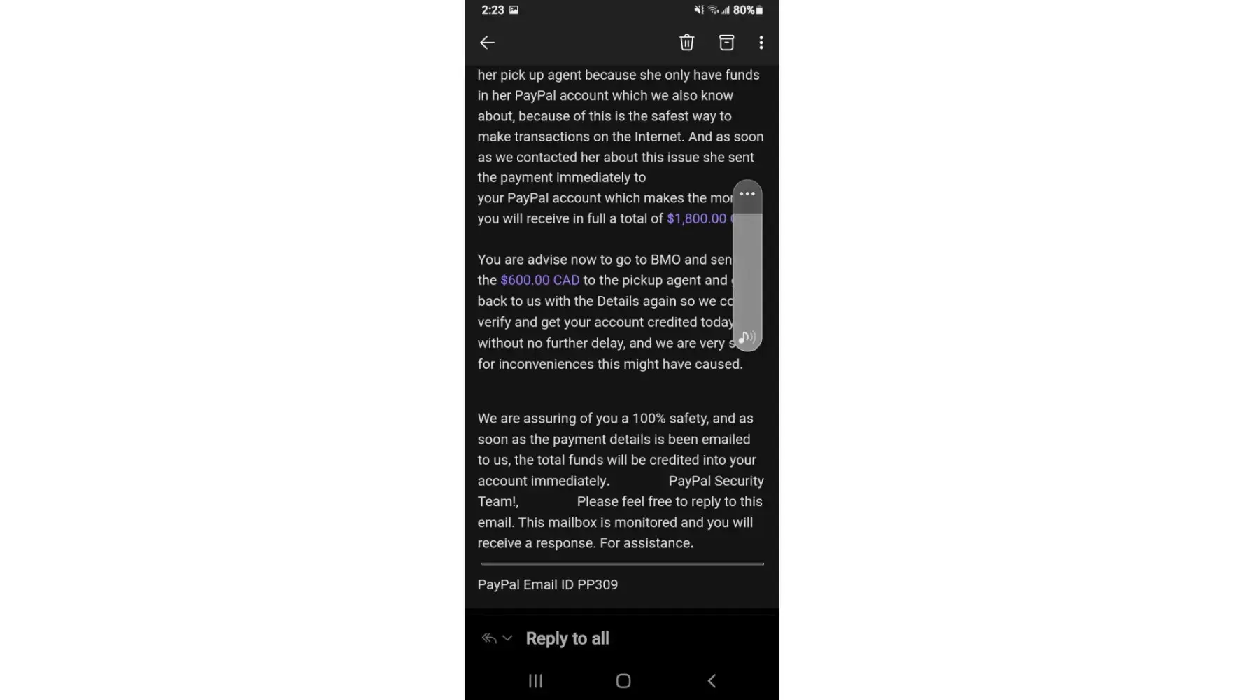 I do the same as I know they are scammers...don't use PayPal or accept a certified cheque etc. Cash or emt in Canada that's it