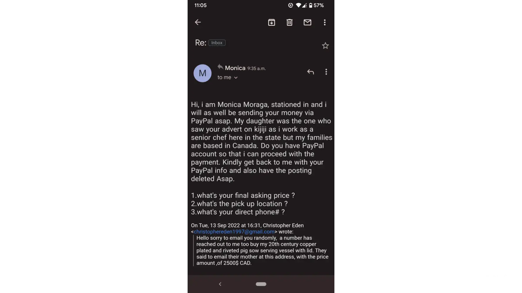 Yeah she Just tried to buy a 20th century copper plated pig serving vessel from me asking me to make a PayPal literally word for word same stuff in email. She's now changed it to Monicamoraga025@gmail.com
