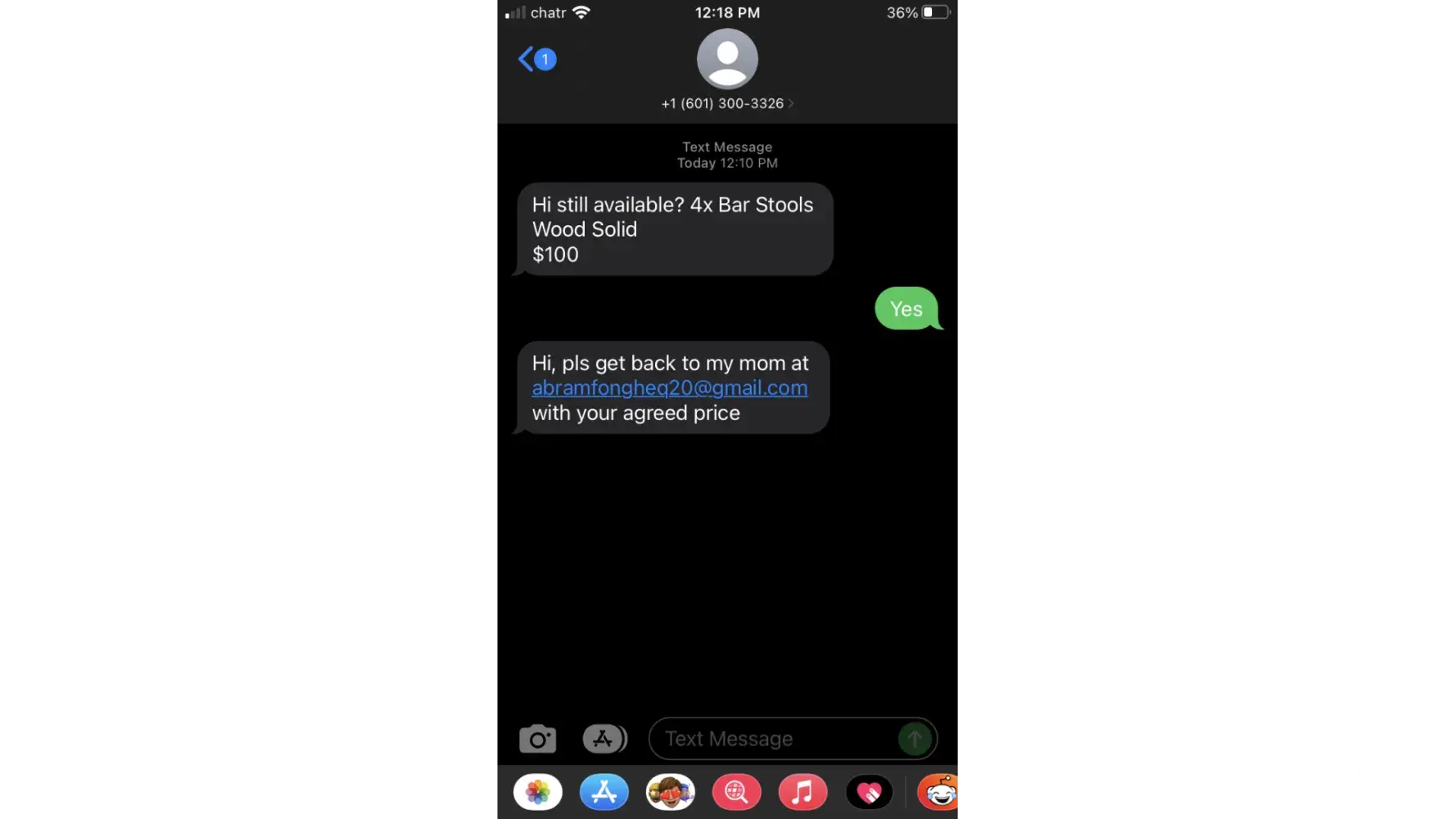 Same here. I posted some chairs on Kijiji. Got a text message from [protected] asking if they were still available. I said Yes, to which they replied word for word: Hi, pls get back to my mom at abramfongheq20@gmail.com with your agreed price
