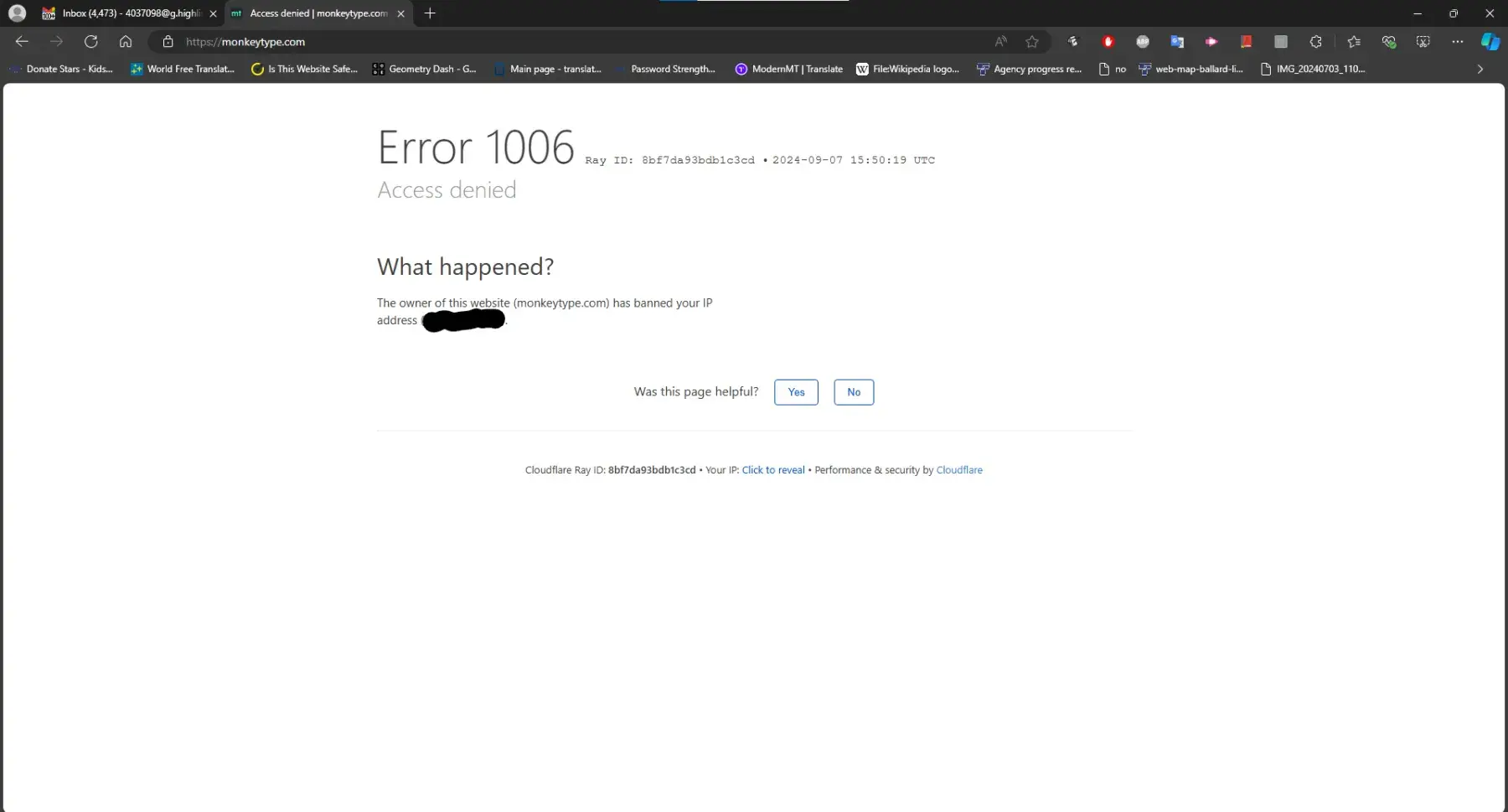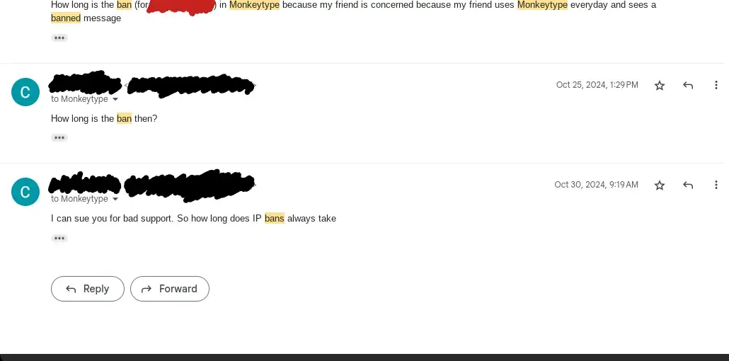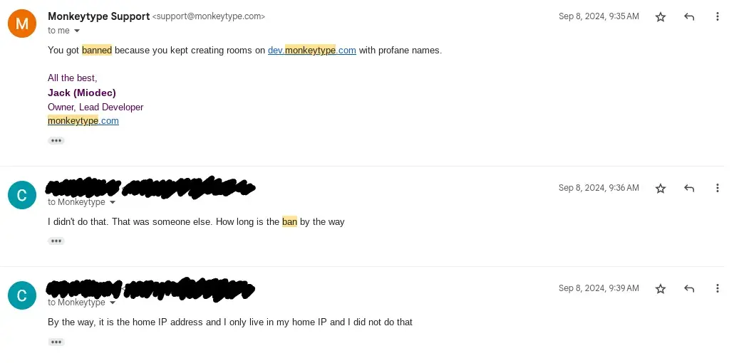 Hello! In 2024, Monkeytype (the website https://monkeytype.com) banned me from using Monkeytype without a reason. The ban is my IP address, not my account. It doesn't say a reason why I was banned and does not mention how long I was banned. However, I did contact support (by email) but they never responded. Here is the response from what is happening here...