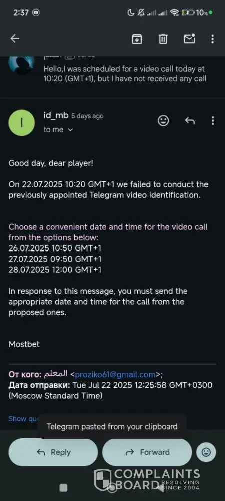 MOSTBET ID 245347140 Hello, This is the second time you scheduled a video call with me but didn’t show up. I have already sent all the documents you asked for. Please unfreeze my account — I have done everything required and waited patiently. I hope you solve this as soon as possible. Thank you. I was waiting again today for the video call, but once...