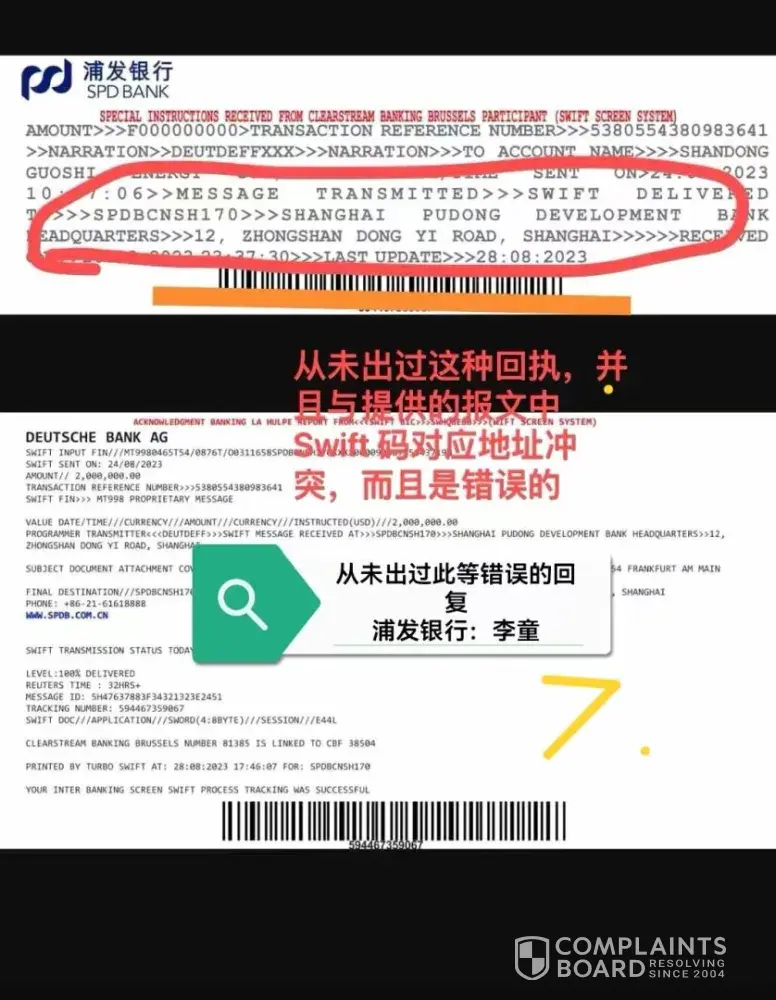 Then on 25th August, 2023, Mr. Onwudinjo sent us a copy of the purported APG SWIFT message with the name of Olivier Vigneron – Chief Risk Officer with Deutsche Bank as the one that signed the document. He, Mr. Onwudinjo asked us to get in touch with Shandong Guoshi Energy Company to reach their bank, Shanghai Pudong Development Bank, that the APG was already in the SWIFT system. He also sent us a purported SWIFT acknowledgment copy (Document marked 3.) and then on 28th August, 2023, he sent us copies of a purported acknowledgment from SPDB and a SWIFT tracer. (Document marked 6.)