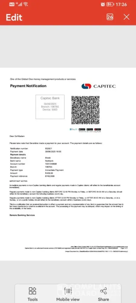 I am a customer of vumatel fiber and do payment via mweb. On 30th June 2025 I made payment of R439 to mweb and later on when I did enquiries the agent informed me that I made payment into mwebs direct account and that they will refund the money within 5-10 days but I haven't received my money or heard from mweb. I have been trying to contact mweb by...