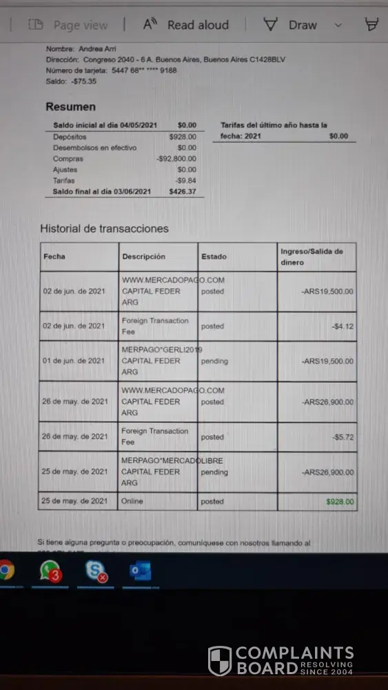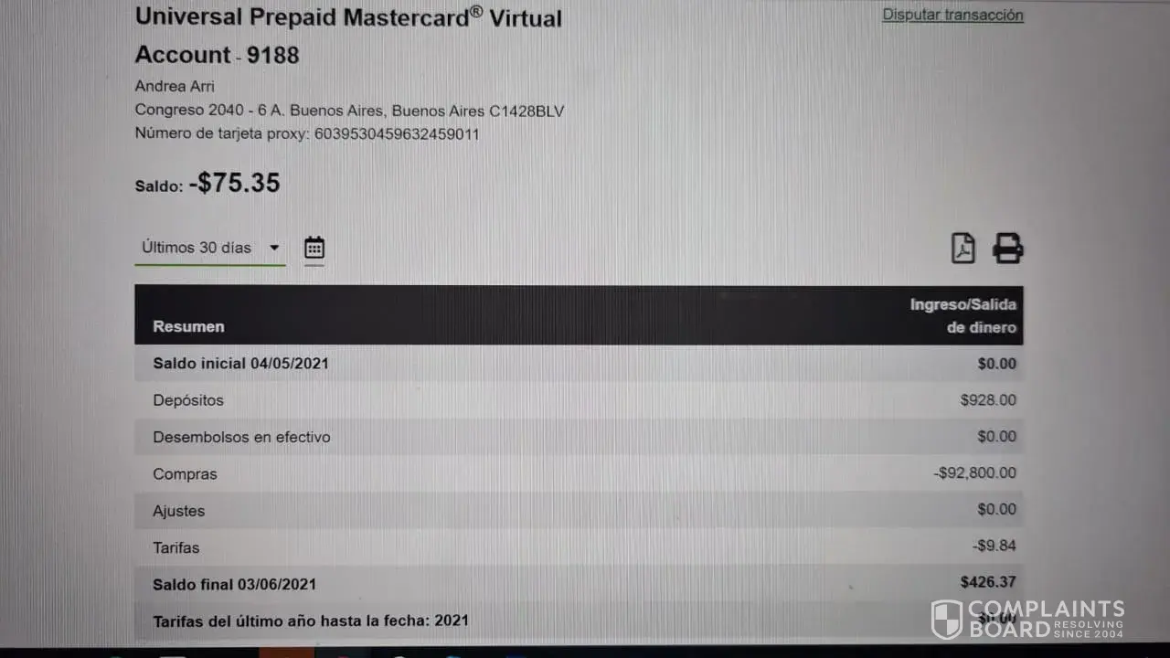 Even though in this attached statement the balance appear as: 426.37 (this is correct) in the web page appear as - 75.35 and I cannot use the card because my payments are rejected.