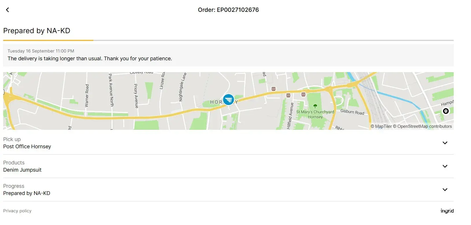 Dear Sir or Madam I ordered the Denim Jumpsuit Blue on 9th September 2025. Since this day, the only communication I have received is that of the screenshot that I attach. There has been no further update about my order, since 16 September 2025 and as you will note from my screenshot, that there is no further update for over a week now. The yellow line...