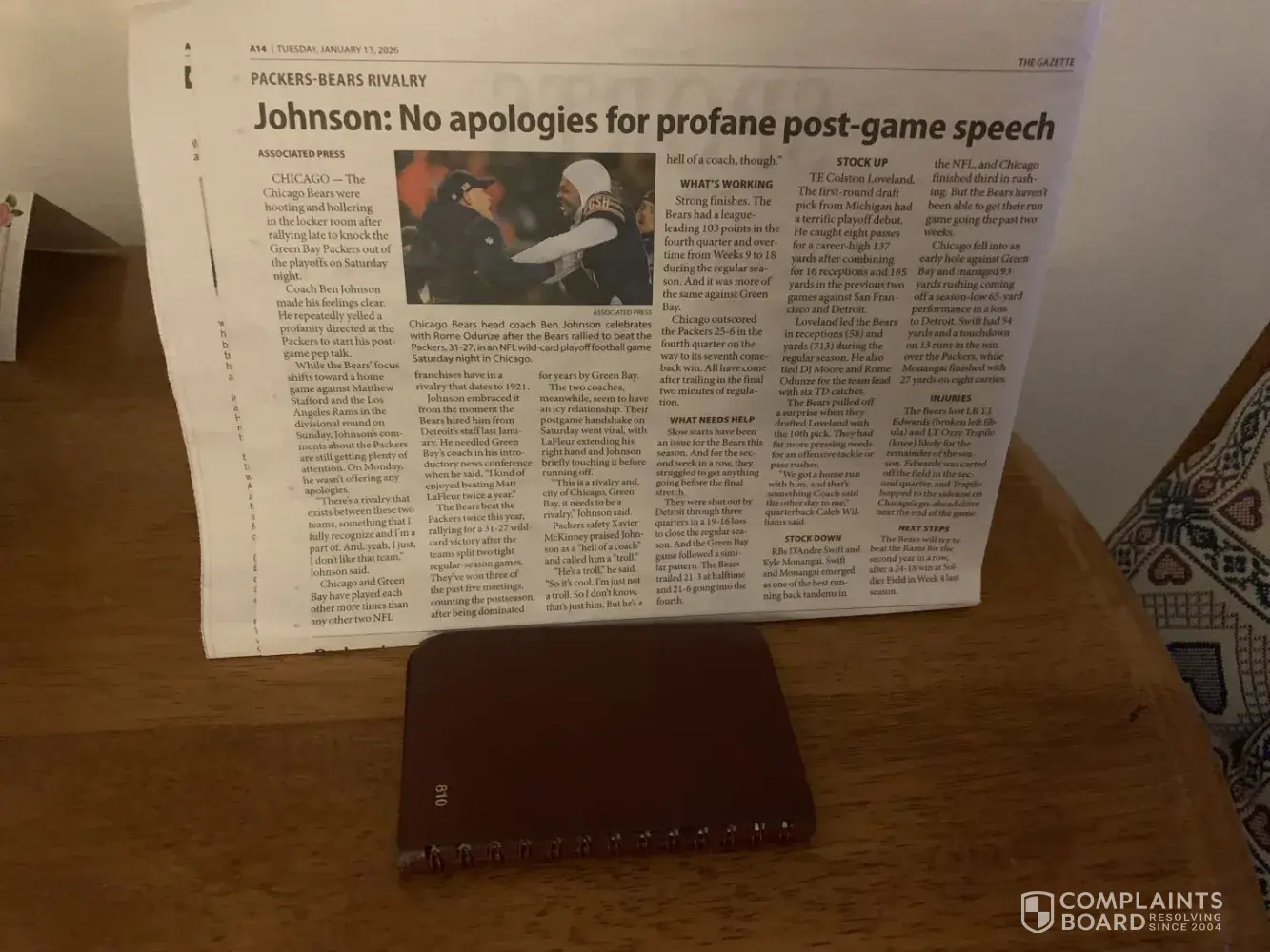 On Jan 13,2026 coach Ben Johnson used SO much profanity describing the Bears win against the Green Bay Packers. There is an article by the associate press. He will not apologize for his words. I understand it’s a rivalry game, however, Ben Johnson crossed the line. Ben Johnson was extremely rude to Coach Matt LeFluer at the end of the game. The player...