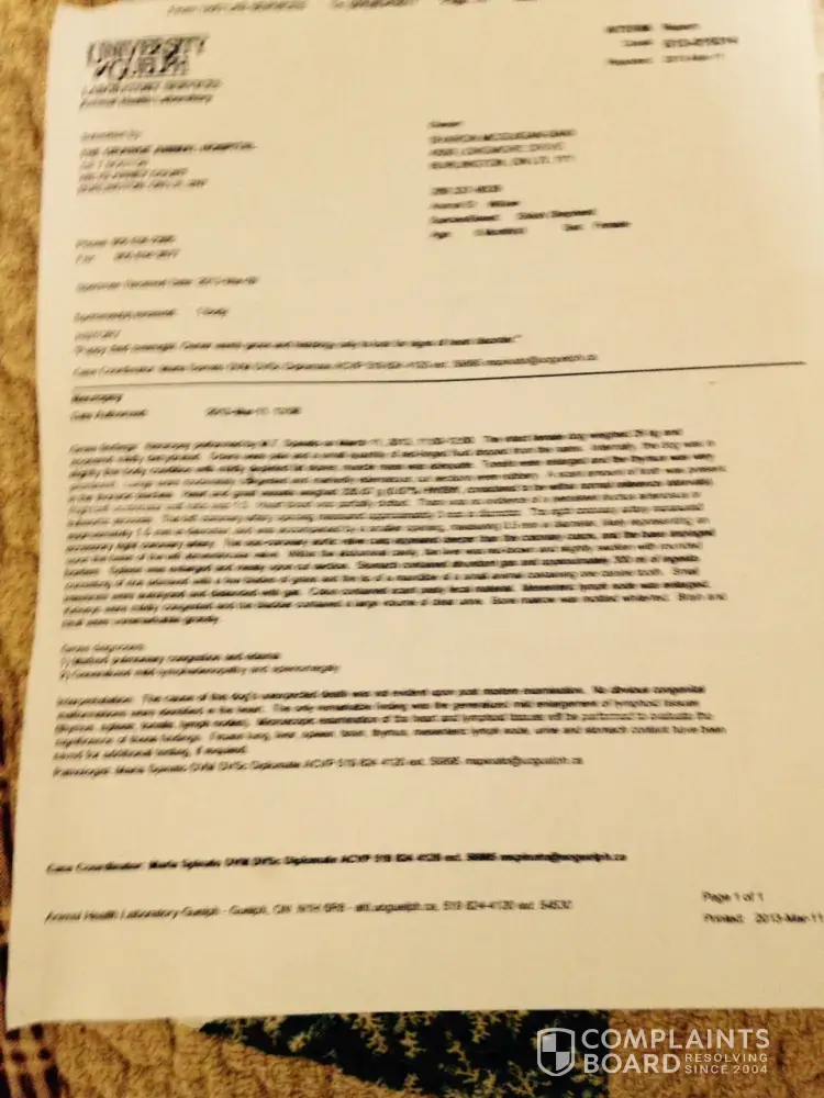 I did not hear from Lisa Barber by March 11/13 so I emailed her again. I also posted on Facebook what had happened to Willow and asked people who may have information on New Zion contact me. I was then bombarded with messages and calls from people who had had bad experiences with New Zion. I also learned that at least one other pup with the same Sire as Willow died suddenly without warning.