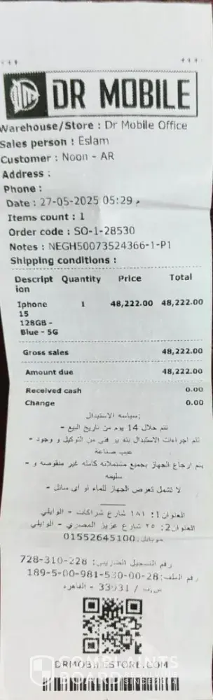I purchased an iPhone 15 128GB (International Version – Green) through Noon Egypt on May 27, 2025 (Order No. NEGH50073524366), sold by Dr. Mobile.