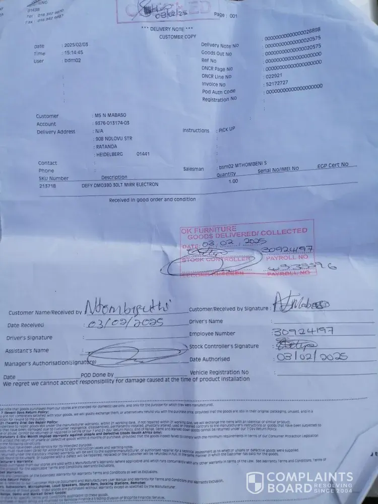 I bought a double bed and 8kg washing machine from OK furniture with credit it was the beginning of February 2023 not sure the date... sales person was Thando I was approved with the application then sales man gave me contract it was more than 50 pages he asked me to sign yes I did sign but he did told me about insurance they have. he told me about the guarantee of the machine they deliver the things on the 5th of March 2023 I was called it was 50 min I was at work my boyfriend told me my house is burning I quickly went to the house everything from my room was burned the fire started from the bed, we called the police and councilor, unfortunately the police didn't came immediately up until I went to police station we made an affidavit. Monday the 6th I went to OK with the proof of address that has burned the ID and affidavit when I got there the manager told me no we not gonna help you because the sales person chose a wrong insurance for you he suppose to choose All risk not credit life so you not gonna get anything I left I was hurt cause no one told me with the insurances they have and I lost everything I didn't invite the fire I don't want. I told my uncle who's a layer he told me to asked the copy of the contract I went to OK they say they don't have it I don't understand why cause mine was burned my uncle phone them then they phoned me back after two weeks of incident they ask for that affidavit, id, fire report to the store when I got there, same manager told me there's no case number in that affidavit I must go and get it and come back so that they can give me a latter that tells me I do not qualify for a claim 😠I cried I felt like everything is falling apart in my life I have to pay for something that I don't have for years I started not to focus on my work until I upscond and got fired... I feel like something is going on why they don't want to give me a copy surely they have and why they don't fire that guy... I went to OK and gave them the letter that I'm not working I upscond they say I'm not qualified for the insurance cause it's my fault to quit the job it's not like I'm retrenched or disable I'm confused which insurance is covering it seems like everything I'm coming with the insurance is not covering please help
