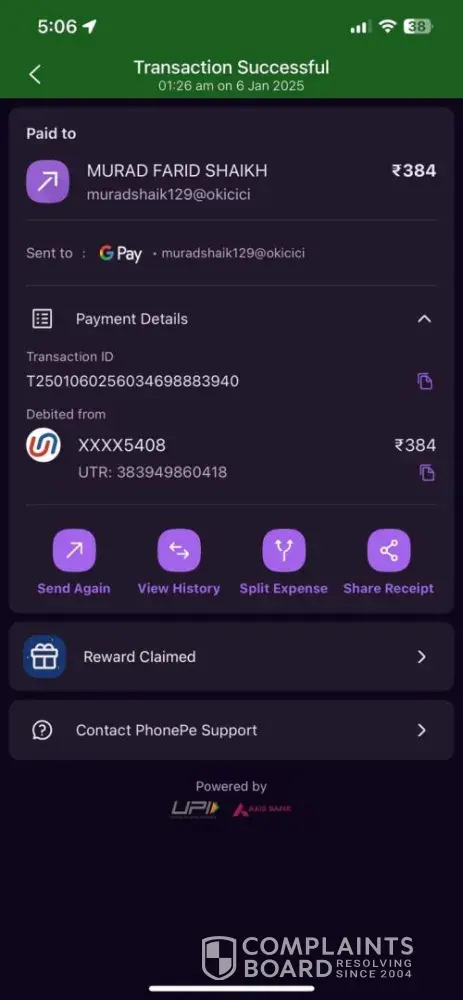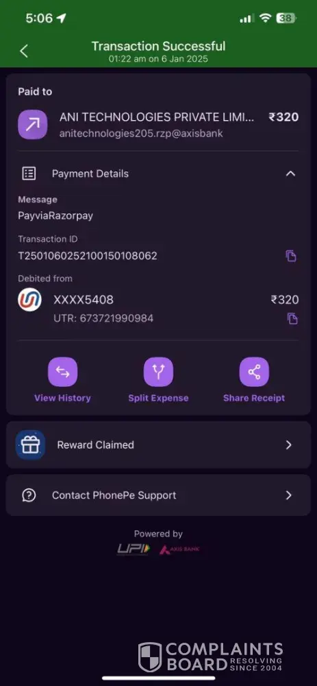 Book a cab to the airport on 6th January 2025 and it gave me a option to pay on the pay which i already paid amount of INR 320 then once i reached the airport the cab told me he didnt receive any amount so i had pay again to the cab which INR 385.Kindly find the attached proof of UPI payment and cab ride details. I need a refund immediately to my ola account. Also i am available only through emails.