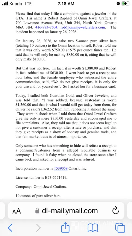 Took ten ounces of pure silver bars to sell at the 700 Lawrence Avenue West location on January 26, 2026. Robert Raphael was the staff who claimed to be the owner of Omni and that his location is the head office. He said it was only worth $750 and that he will only make $100 dollars on it so only $850. Turns out to be a lie, he operated with unfair...