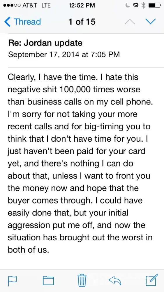 I sent my 1986 jordan rookie psa 9 to Dave thorn of small traditions on August 22nd 2014. After the card sold for a meager $2246, I tried attempting Dave 3 weeks after the auction ended a she became very nasty and hostile over paying me. He started a fight with me after I gave him $38, 000 dollars worth of business. In January and took forever to pay me...