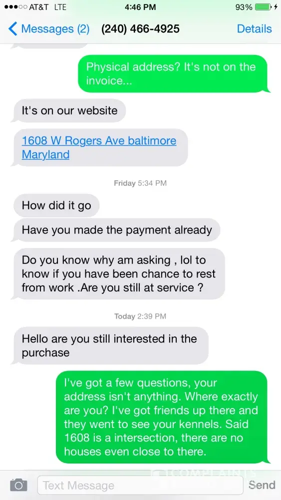 James or Jenny contacted me after I inquired about purchasing a puppy from them. They were pushy at first and then changed tactics to friendly and supportive and even concerned. They kept pushing for western union transfer and their address they gave me personally via text was fake, it's an intersection with no houses in the area. Closest one is about a...