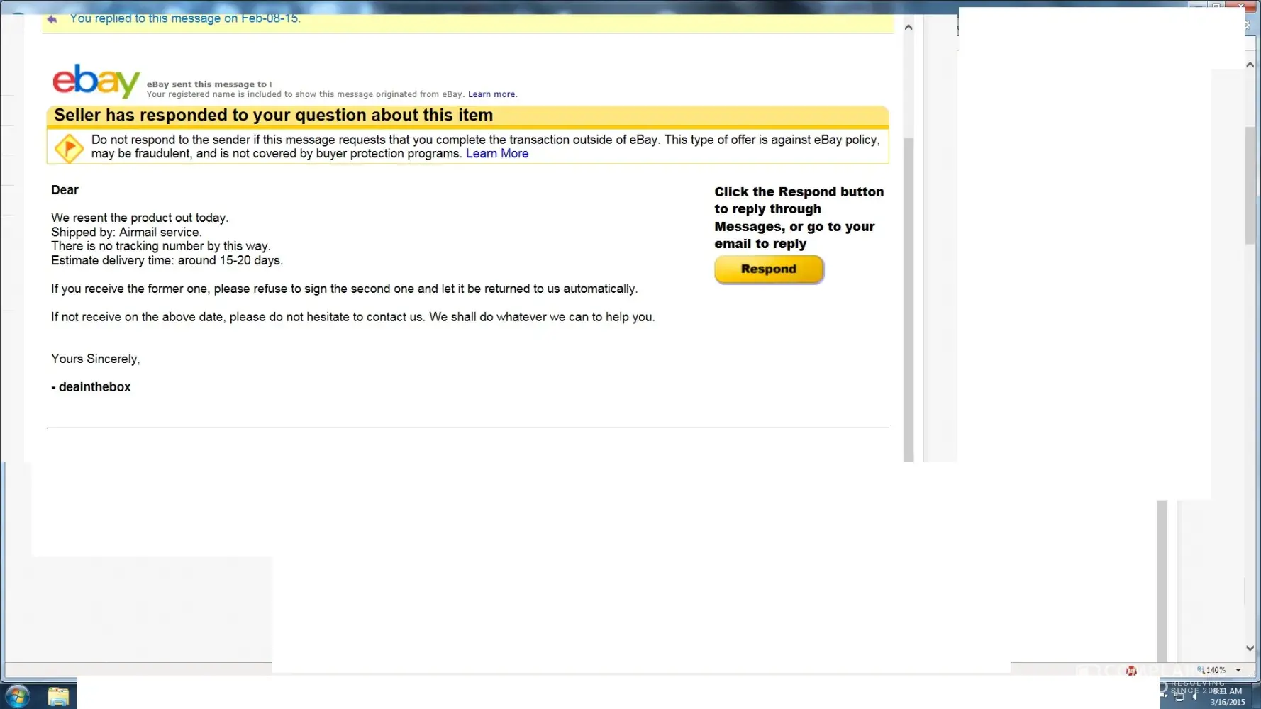I ordered something from Ebay Seller Deainthebox on November 24, 2014. The seller emailed me on December 14, 2014 to inquire whether I had received the item or not. I replied that I had not. Deainthebox suggested it may have gotten lost in the mail so they would re-ship on January 15, 2015 and it would take 15-20 days since it was coming from Singapore. On...