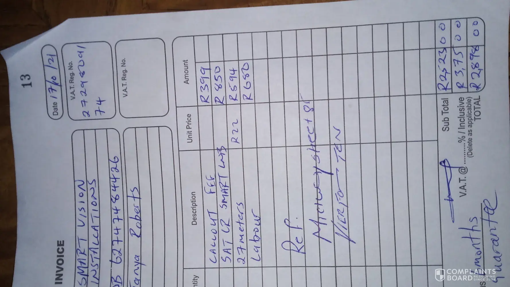 on the 17 October the above company came to repair my dstv, they replace the lnb and 27 meters of coaxcable. as you can see on the tax invoice they charge r 22.00 pm for the coaxcable and r 850.00 for the lnb is this possible? the installation adress wher they repair the dstv: s. vosser ([protected]) midwaystreet 85 vierfontein my daughter tanya pay the tax invoice via eft. can you please see if the prices is normal