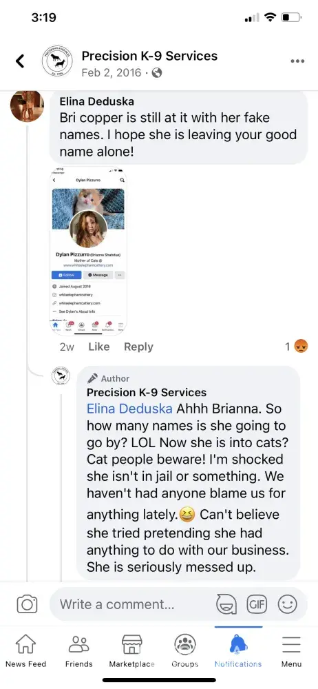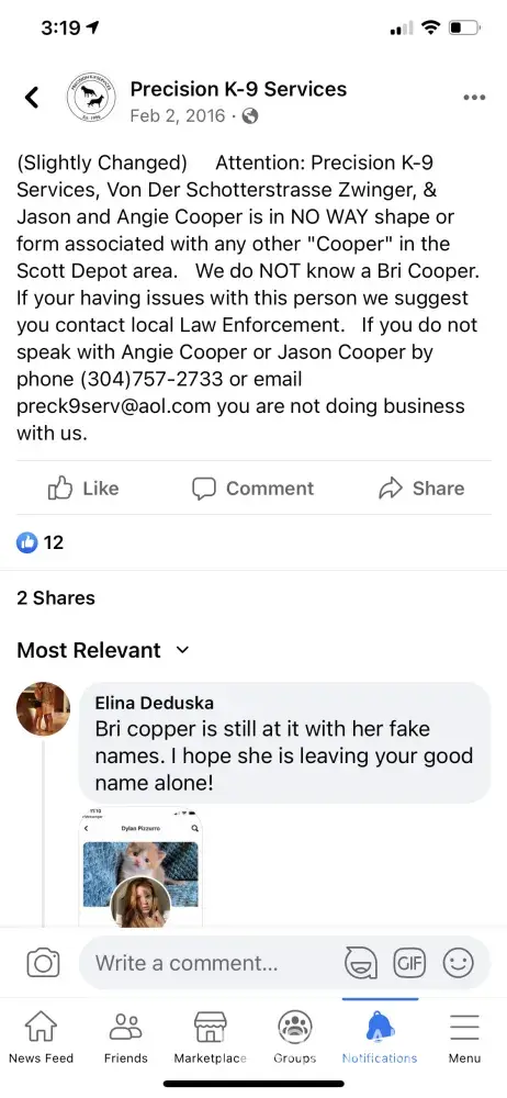 Brianna Shabdue used a fake alias Bri Cooper to pretend she was associated with my family. We are well known respected dog trainers and breeders. She never had anything to do with our family except using our name to promote her scams. For years people contacted us after she took their money. I have been notified recently she is now doing this with cat...