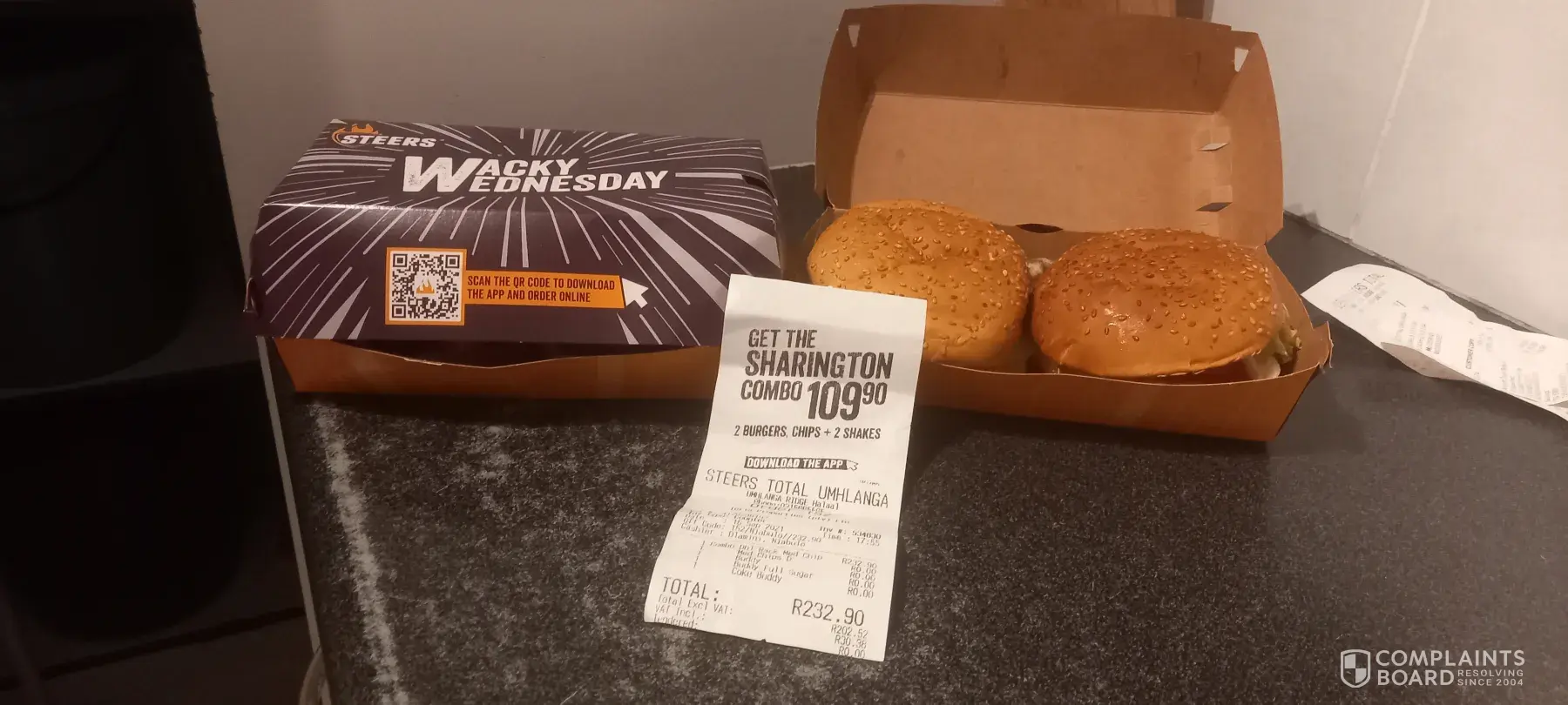 Today 15/09/2021 at 17H55 I ordered (order 152) combo dbl rack & med chips (R232.90) at Steers Toatal Umhlanga as takeaway. Cashier who also dispatched my order was Dlamini Njabulo, invoice 534830. When I arrived home I was shocked to see that I was given a Wacky Wednessday. I subsequently called their number [protected]. Was referred to the manager Amith...