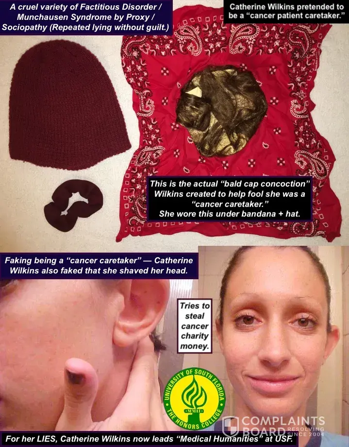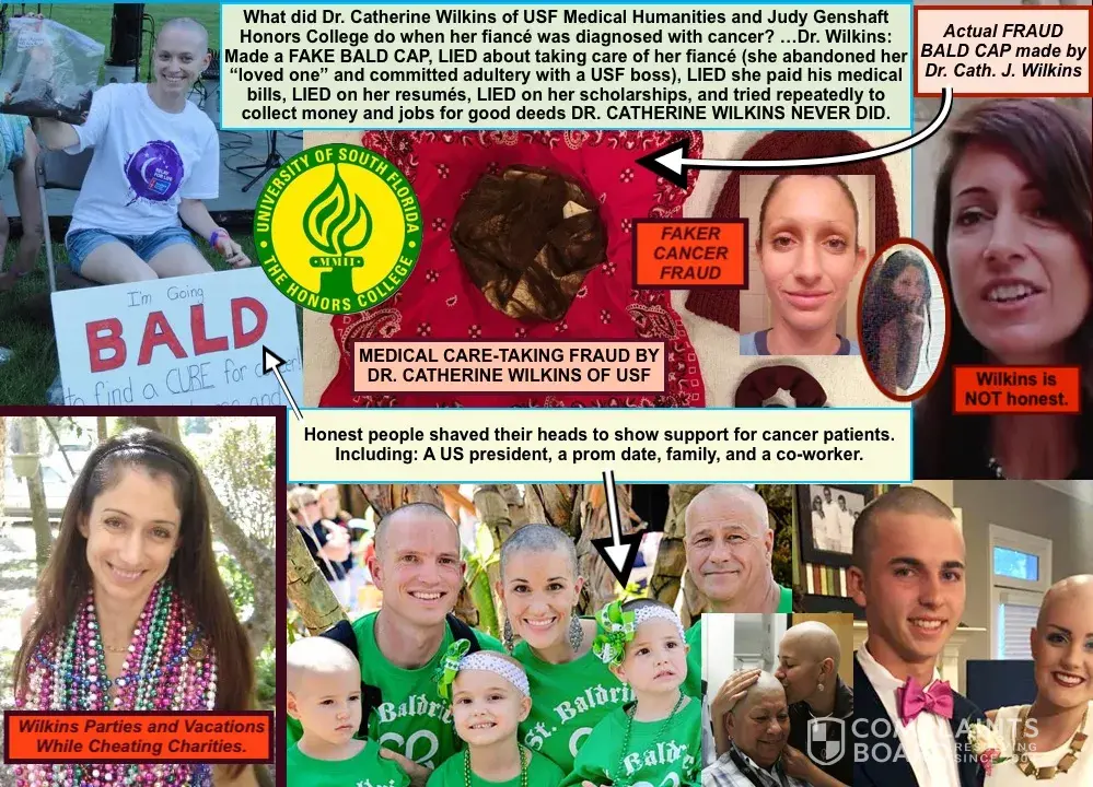 Professor, Assistant Dean Catherine Wilkins For Judy Genshaft College USF: Catherine Wilkins' CANCER charity fraud. Catherine Wilkins repeatedly found opportunities to cheat, lie, and defraud the academic system. Catherine Wilkins tried to steal charity money with a CANCER SCAM. Catherine Wilkins committed multiple instances of charity fraud...