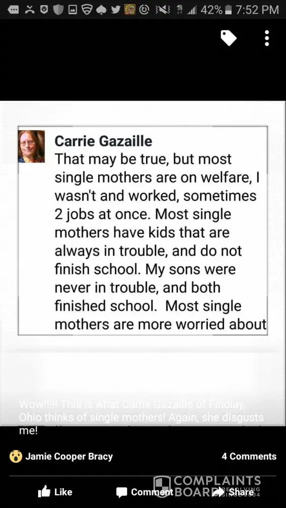 Carrie Gazaille is a horrible person with mental as well as self esteem issues. She is fraudulently on disability because she is to lazy to work. Her husband is equally as lazy and was terminated from Walmart for smoking pot. He is also on disability. So both of them are mooching off the government. Prior to being on welfare, Carrie worked at McDonald '...