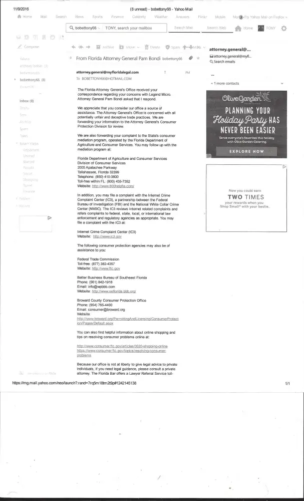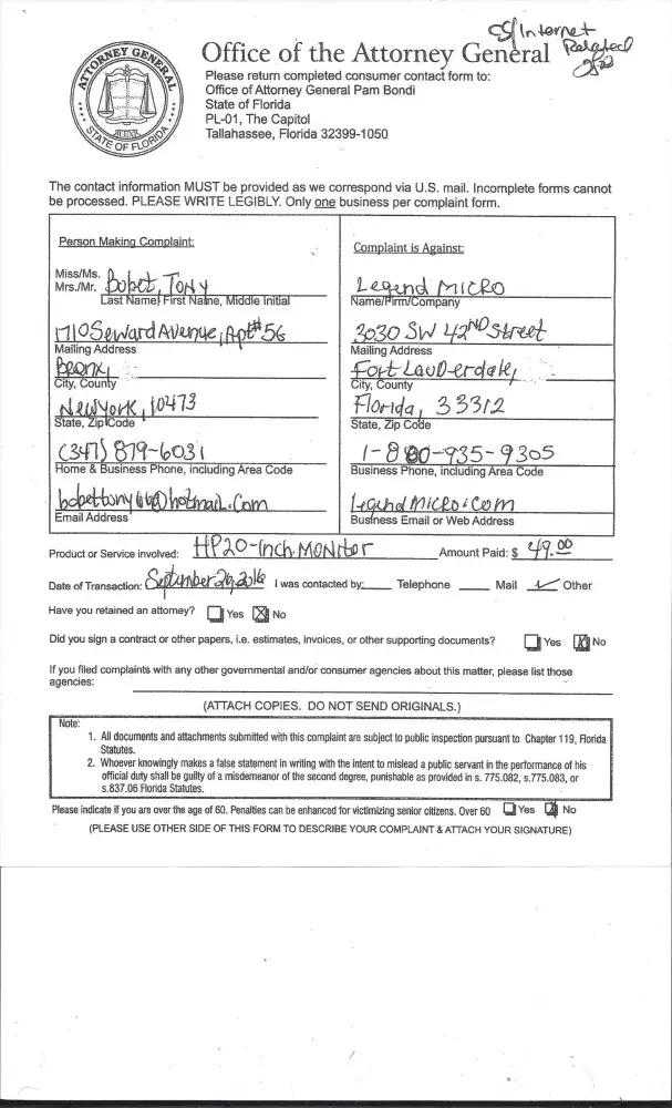 DEAR Sir/Madam: My name is Tony Bobet from New York City. I am filing an complaint to Ashley Morgan, from Fresh From Florida, located at the Rhodes Building, 2005 Apalachee Parkway, Tallahassee, Florida 32399. that the Office of the Attorney General Pam Bondi, located from Pl-01, the Capital Tallahassee, Florida [protected]. The complaint of Legend Micro...