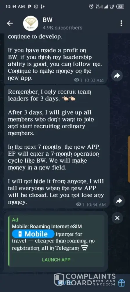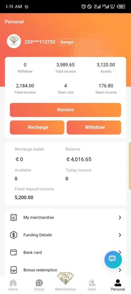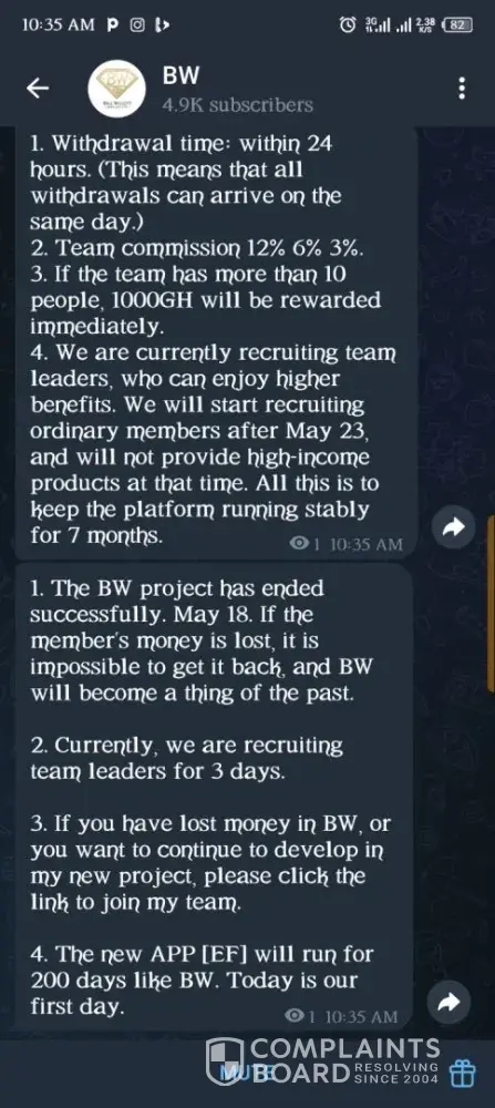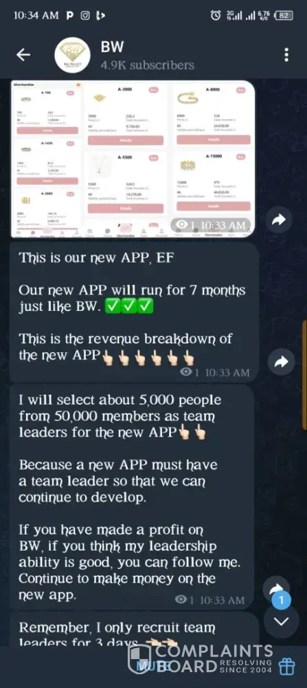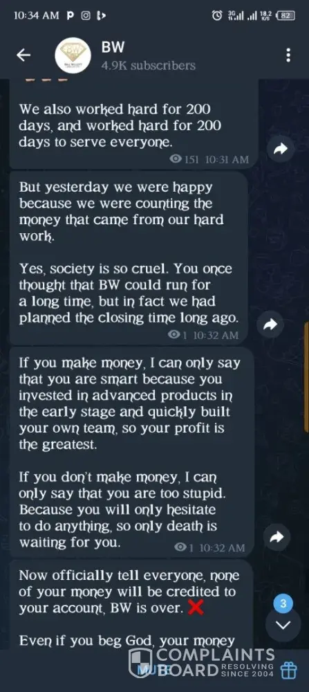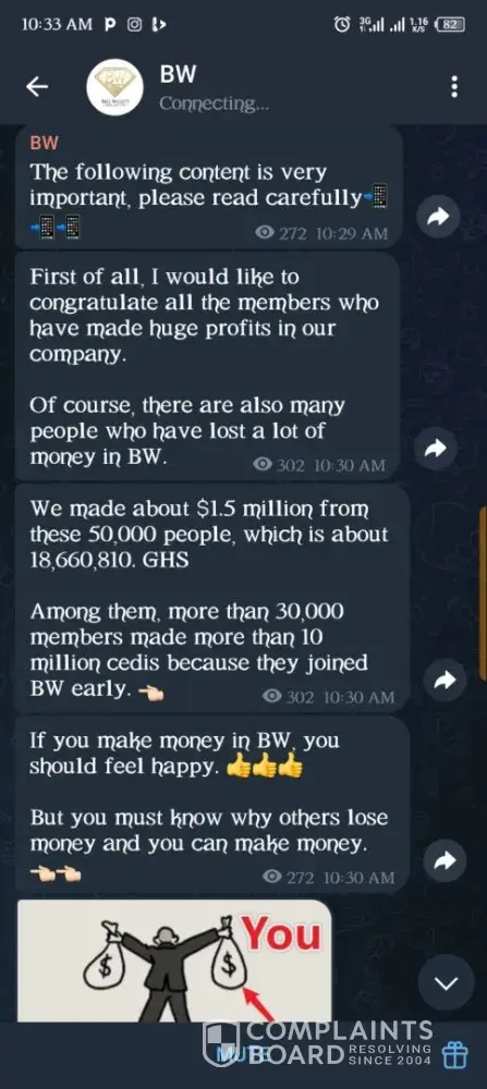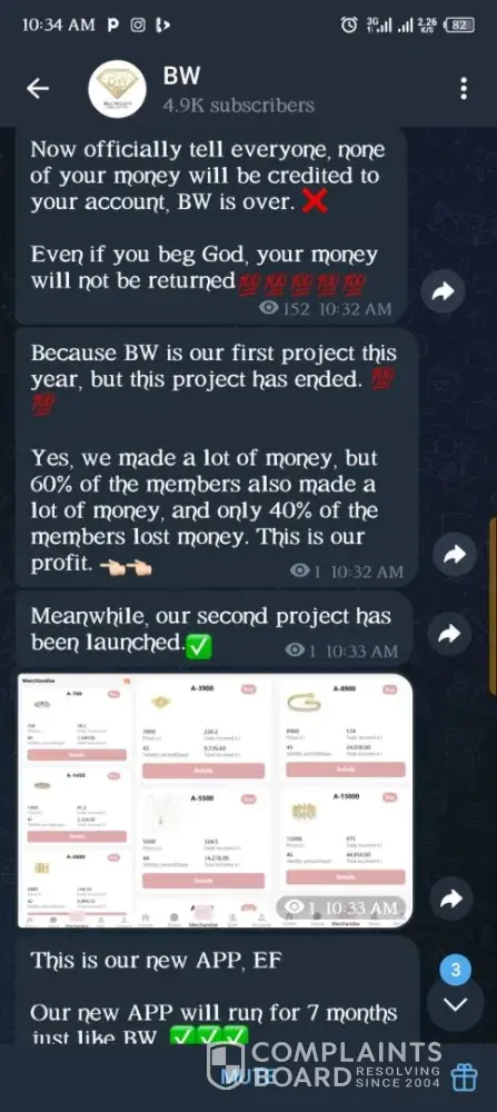 On 11th May, 2025, someone introduced an investment site with the name Bill Willet Jewelry (BW Jewelry). I made a purchase of two of their products worth ¢3000. I issued a withdrawal twice within the week and didn't receive the money. On 16th May, I was asked to make a deposit of ¢1199 to verify my account because they noticed fake accounts in the...