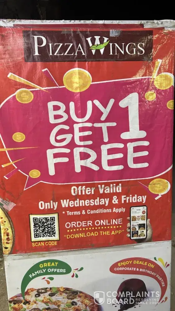 Pizza Wings Denied 'Buy One Get One Free’ Offer and Treated Me Rudely†On Friday, I visited a Pizza Wings outlet to avail of the "Buy One Get One Free†offer that was advertised on their banner for Wednesdays and Fridays. Despite following the advertised terms, I was treated rudely by the staff, and the offer was denied without justification...