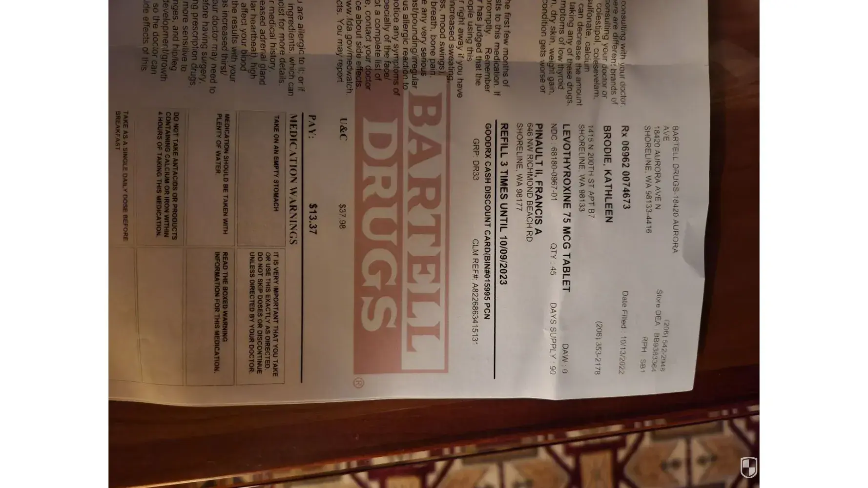 I priced my prescription for 90 tablets of Levothyroxine 75 mcg dosage. Your website said it was $4.10 at Bartell Drug Co. When I arrived to pick up the prescription, it was for 45 tablets (not 90) of Levothyroxine 75 mcg and they charged me $13.37. When I asked the pharmacist, he said the website (Good Rx) was wrong even after I showed him your price on...