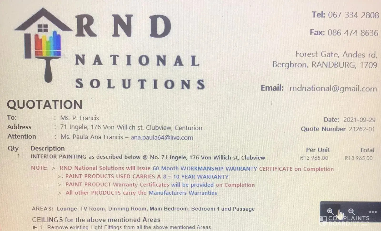 This incident happened in Sep 2021. We accepted this company's quotation to paint our house. We paid a deposit of R6400.00. The day that they were supposed to come paint the house, they did not arrived, they had an excuse that their workers were involved in a car accident, we checked for accidents on this particular road on this day and we could not find...