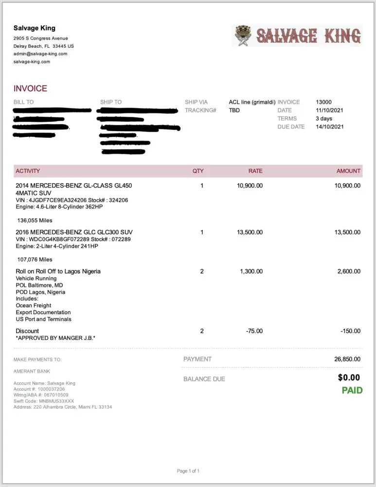 I contacted Salvage King through their website and WhatsApp as advertised on the website for purchase of 2 vehicles on Oct 9. Invoice was sent via email with an Amerant Bank account in the name of Salvage King. Payment was made and confirmed (See attached). I was promised the vehicles will get to the port by Oct 26 by Jennifer who contacted me via whatsapp...