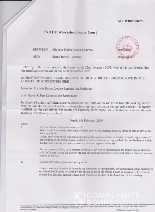 A copy of our divorce papers. Hey I could hid it but its all over the web anyway. My point is this, its not possible to get divorced if you are not married, so why did mortgage companies and creditors believe him when he said he was single? Are they supposed to confirm stuff before they issue funds secured on a family home? ... I am not a lawyer (or similar) just a woman who thought this type of stuff was not supposed to happen in this country. My mistake obviously.