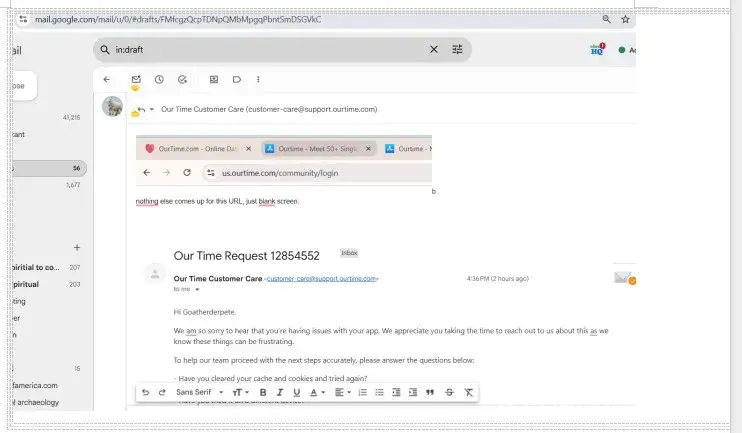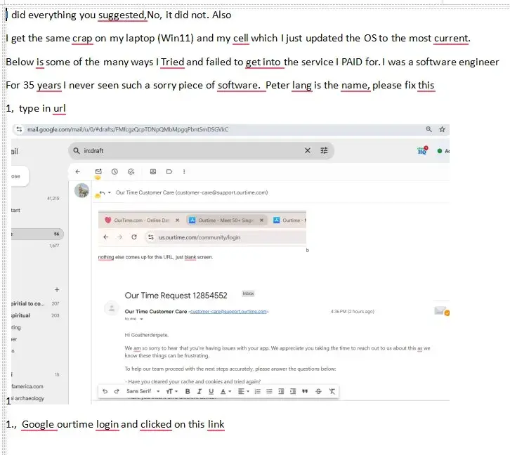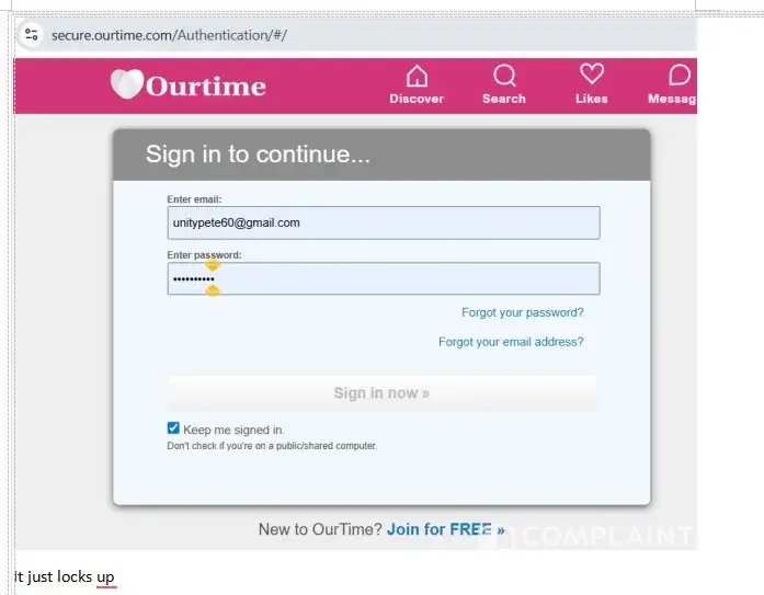 I signed up on the dating website Ourtime.com. The company charged me 22.50 on 8/19/2025. I had 3 days of glorious usage, then I could not login in with the credentials I KNEW I hade put in originally, that had worked before. I was a software engineer for 35 years and did all the standard things, change password, going in via the innumerable emails they...
