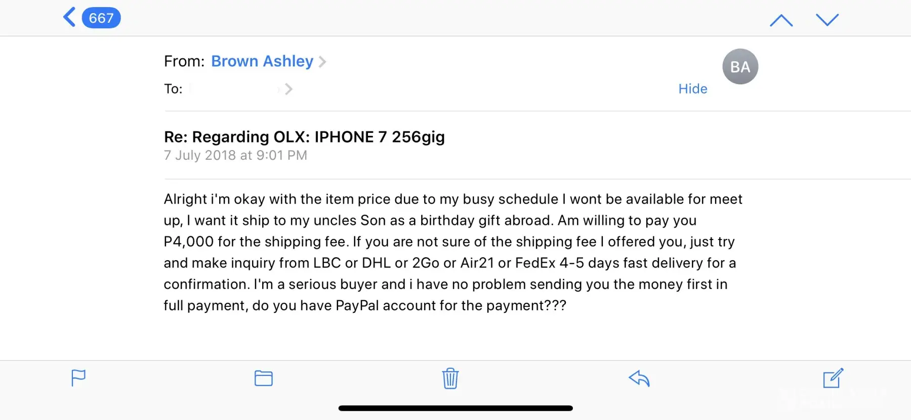 What the fcuk! I got scammed too! IPhone 7 Plus And 30k Php he used Prince Emmanuel same address you've mentioned above. His contact number is +[protected].